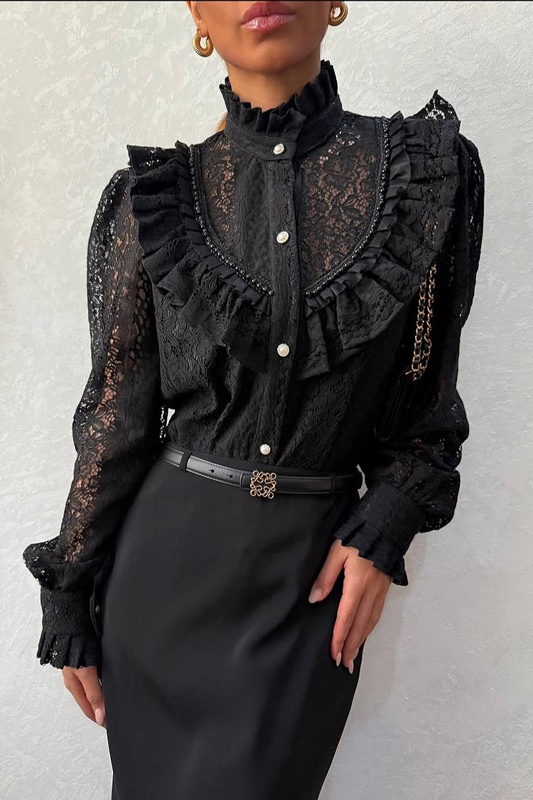 - Model ima gumbe cijelom dužinom, moderan dizajn te spektakularne volane, čipku i ukrasne bisere.