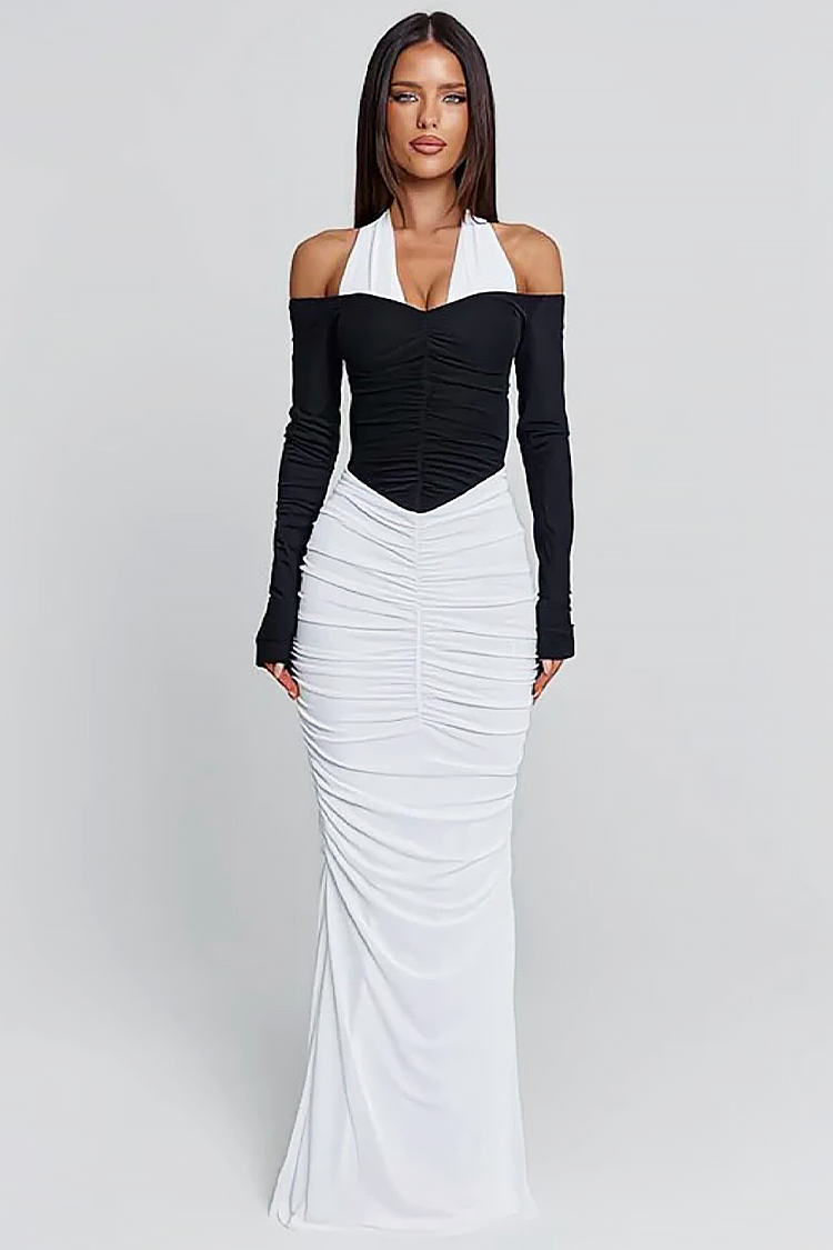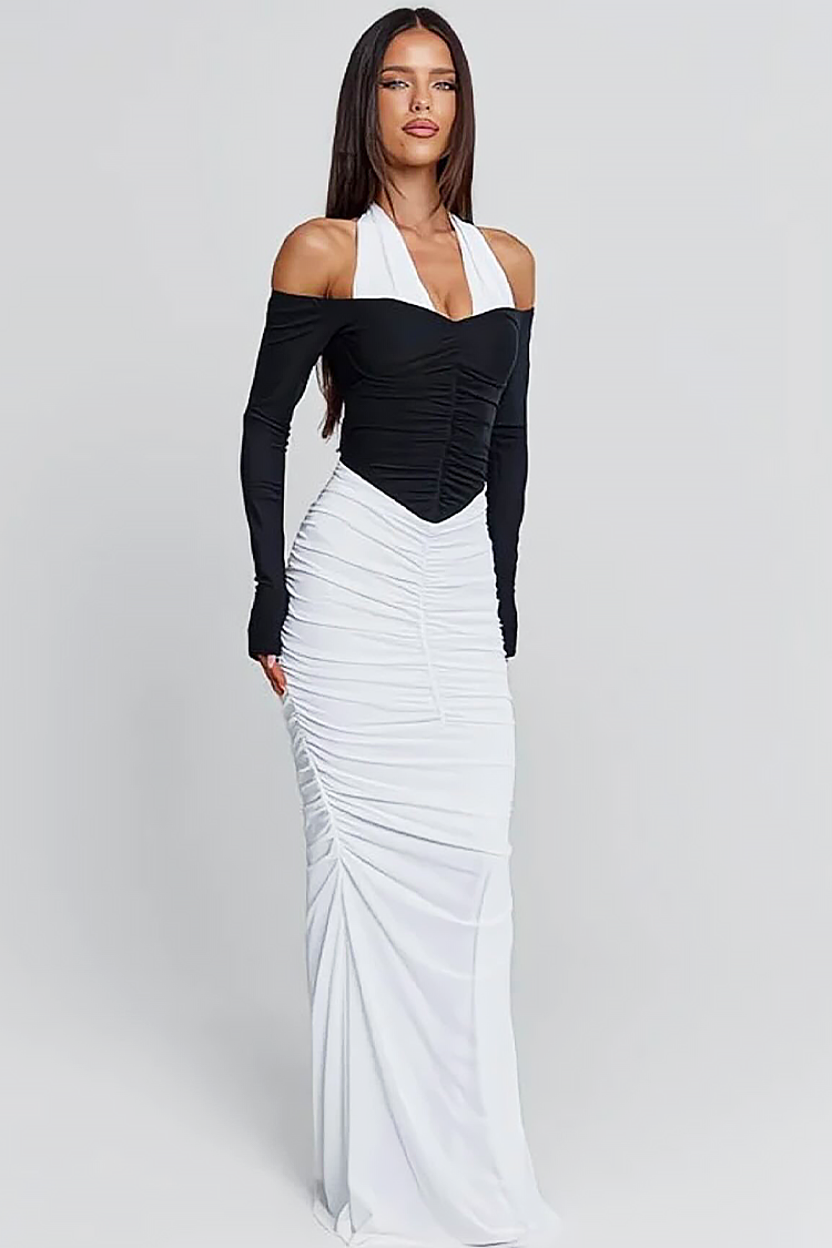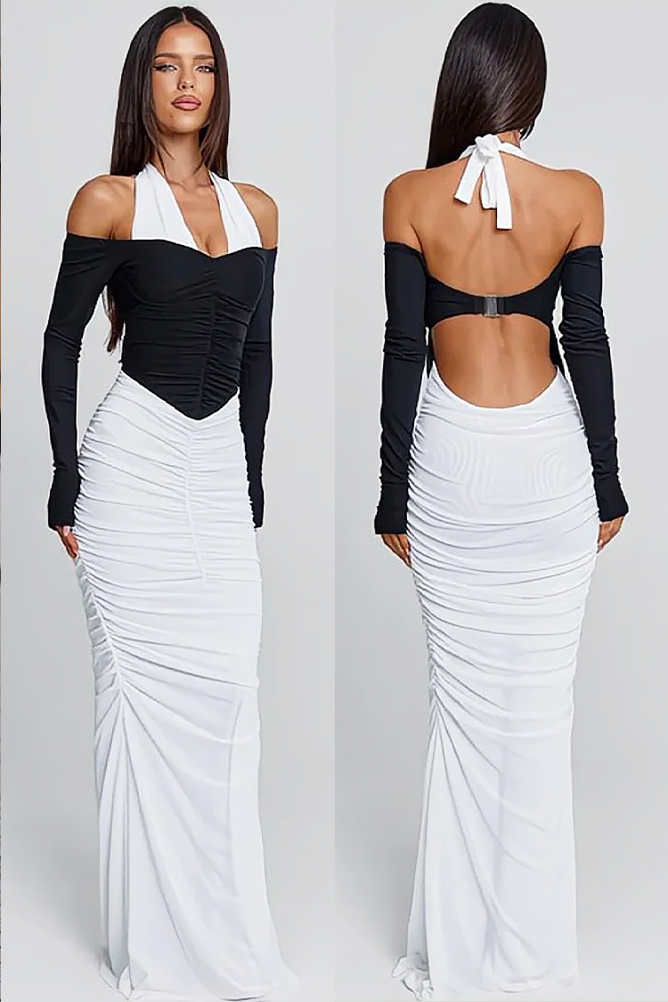 - Model ima pripijeni kroj s naborima na tijelu, gornji dio koji se veže na stražnjoj strani vrata i dugu duljinu.