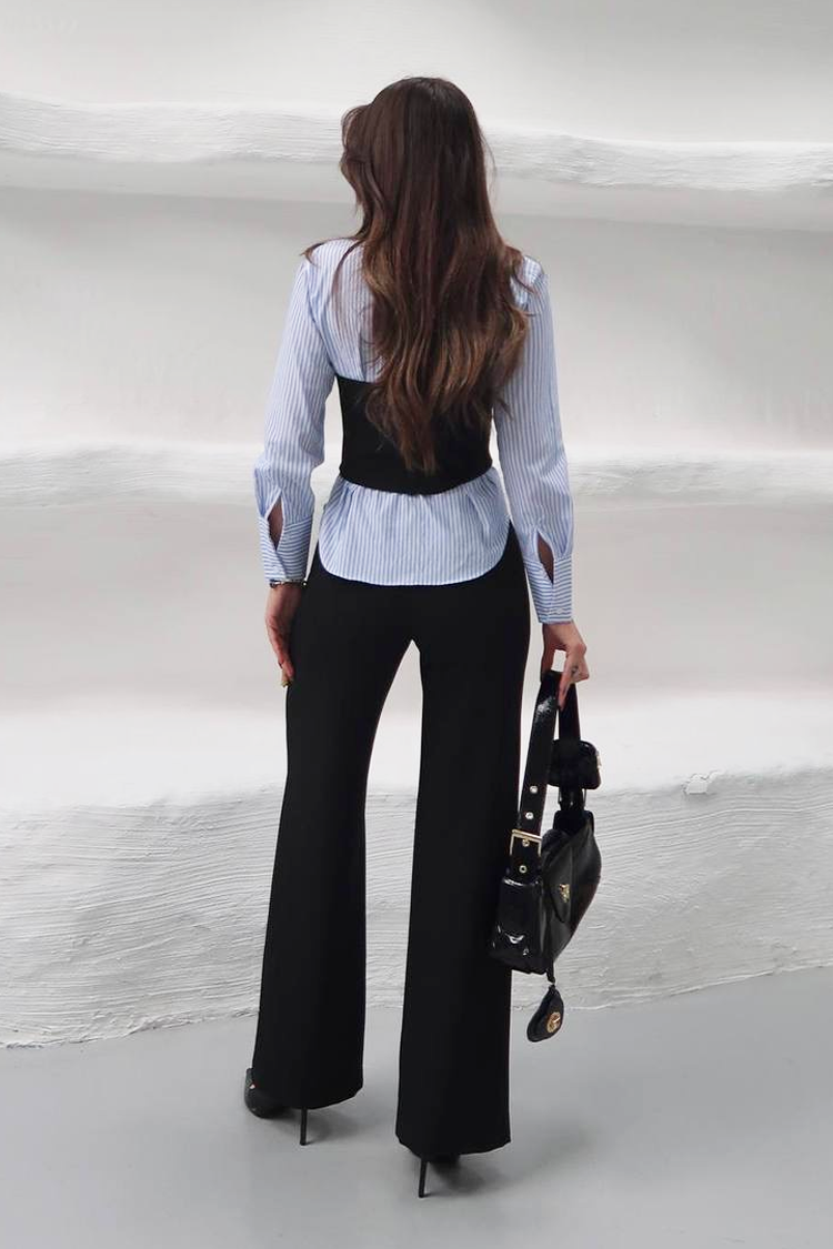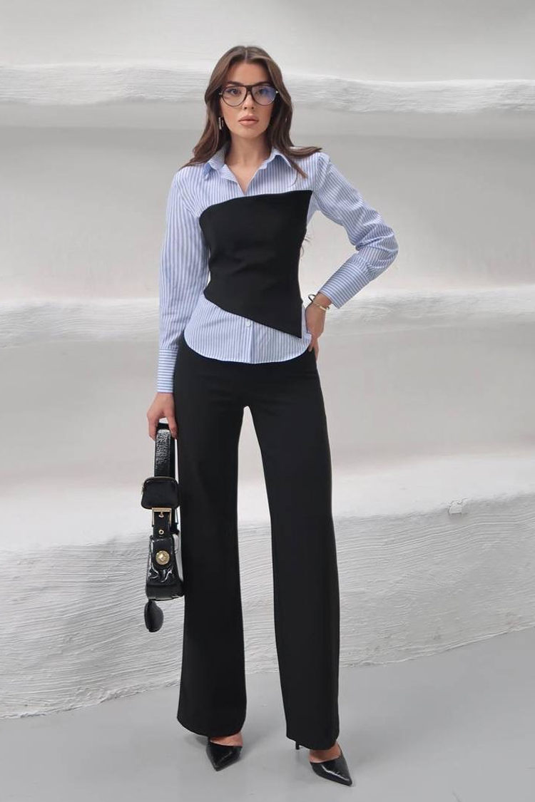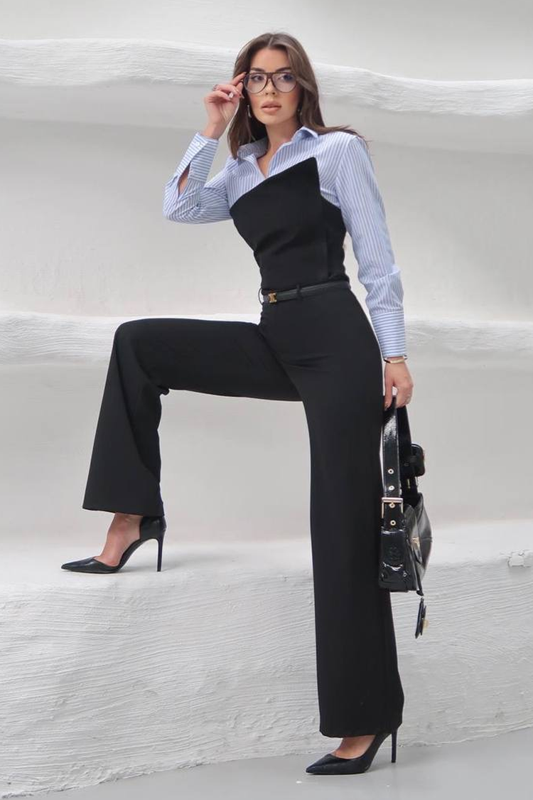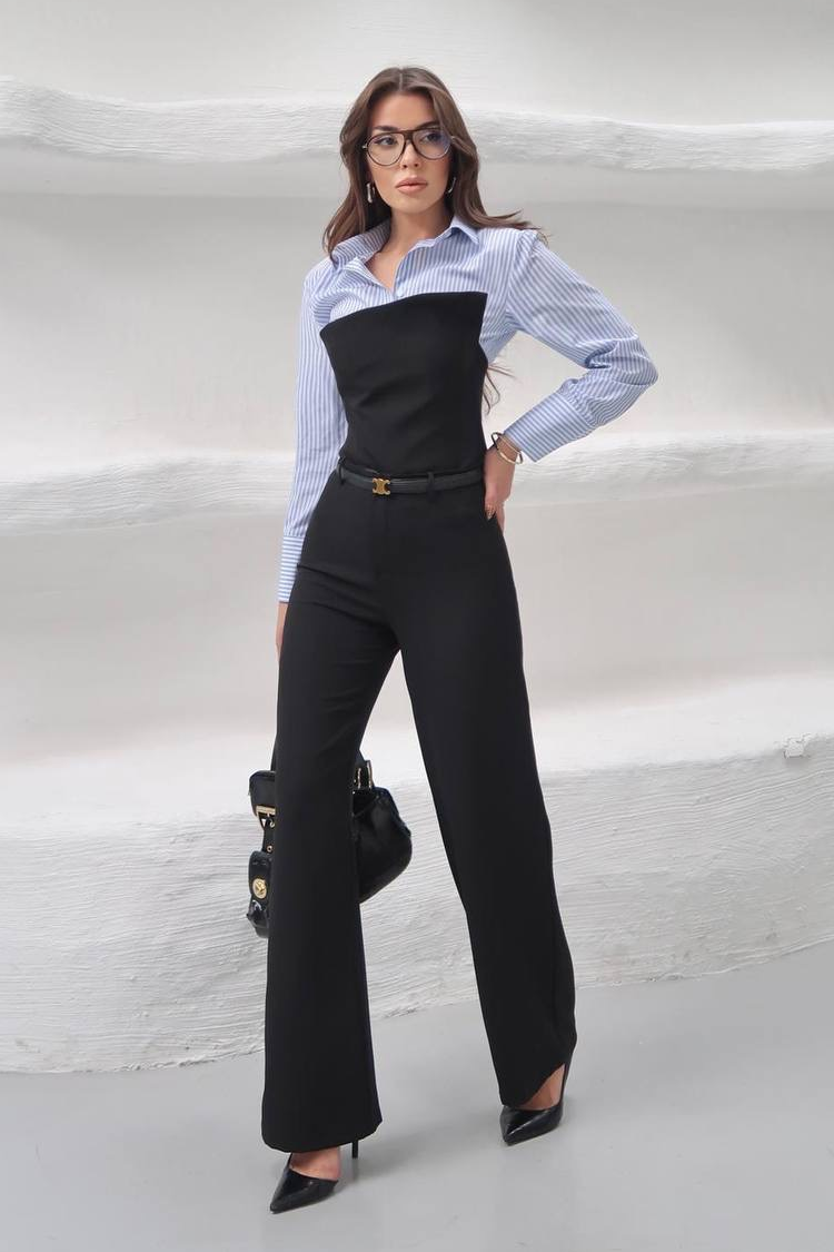 - Košulja ima klasičan kroj, prugasti uzorak i ovratnik, a gornji dio je bez naramenica i seksi dizajna.