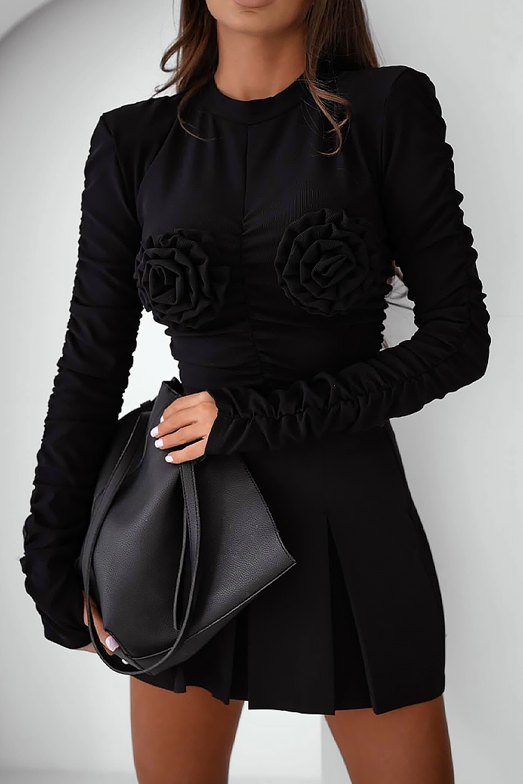 - Model ima uredne rukave, seksi dekolte, pripijeni kroj i ukrasno cvijeće.