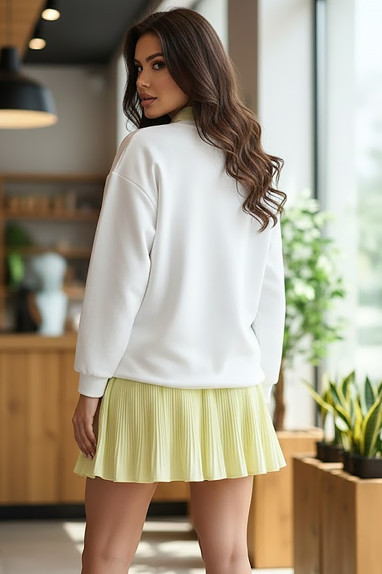 - Suknja je kratka i plisirana, a košulja ima klasičan kroj i ovratnik.