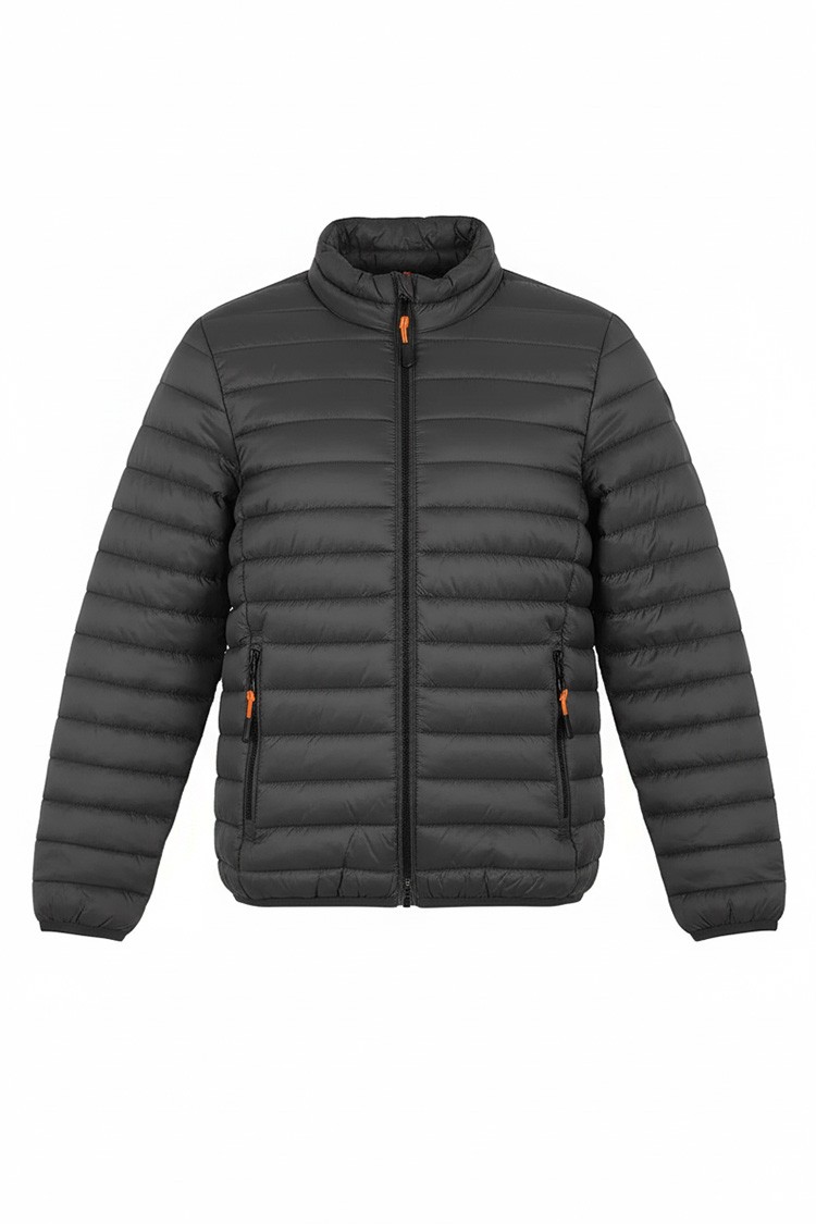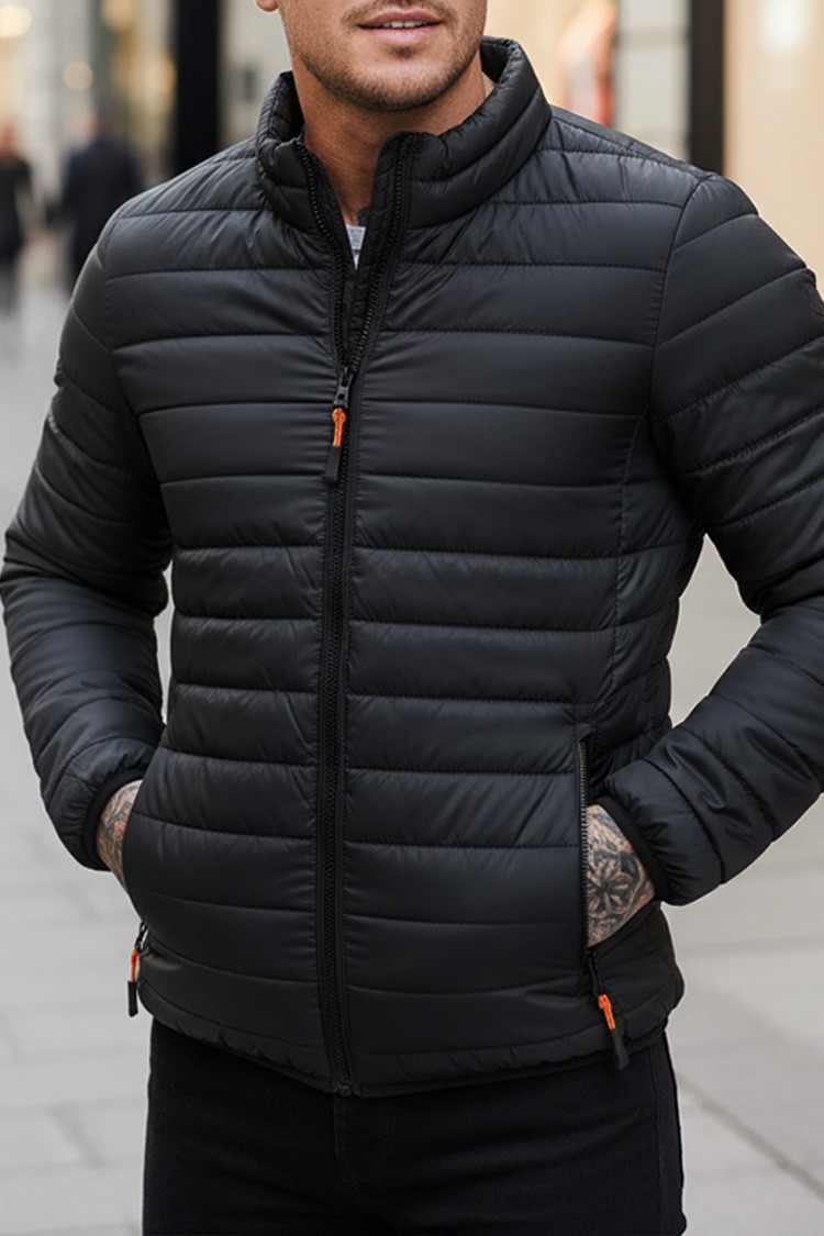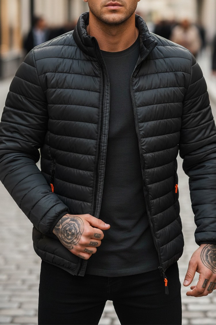 - Prošivena muška jakna jednostavnog dizajna u crnoj boji, prikladna za prijelazna godišnja doba.