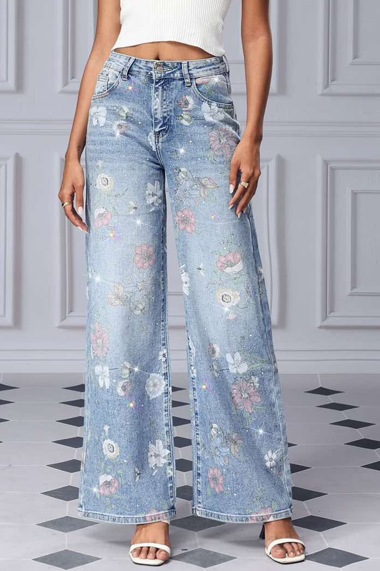 - Model ima visoki struk, široke nogavice, sjajne detalje i cvjetni print.