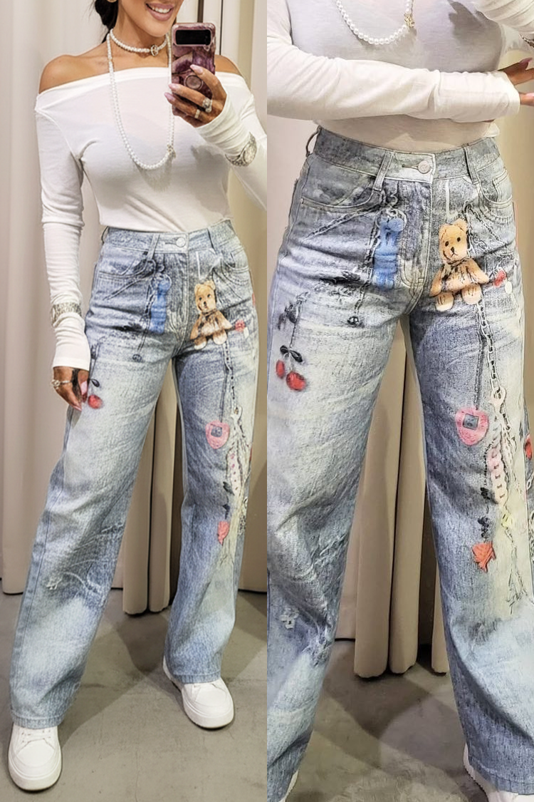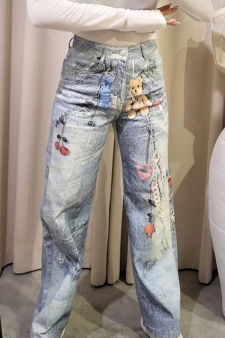 - Model ima visoki struk, širok kroj, bočne džepove i atraktivan uzorak.