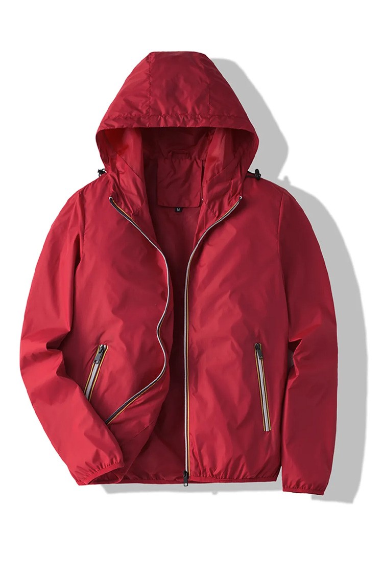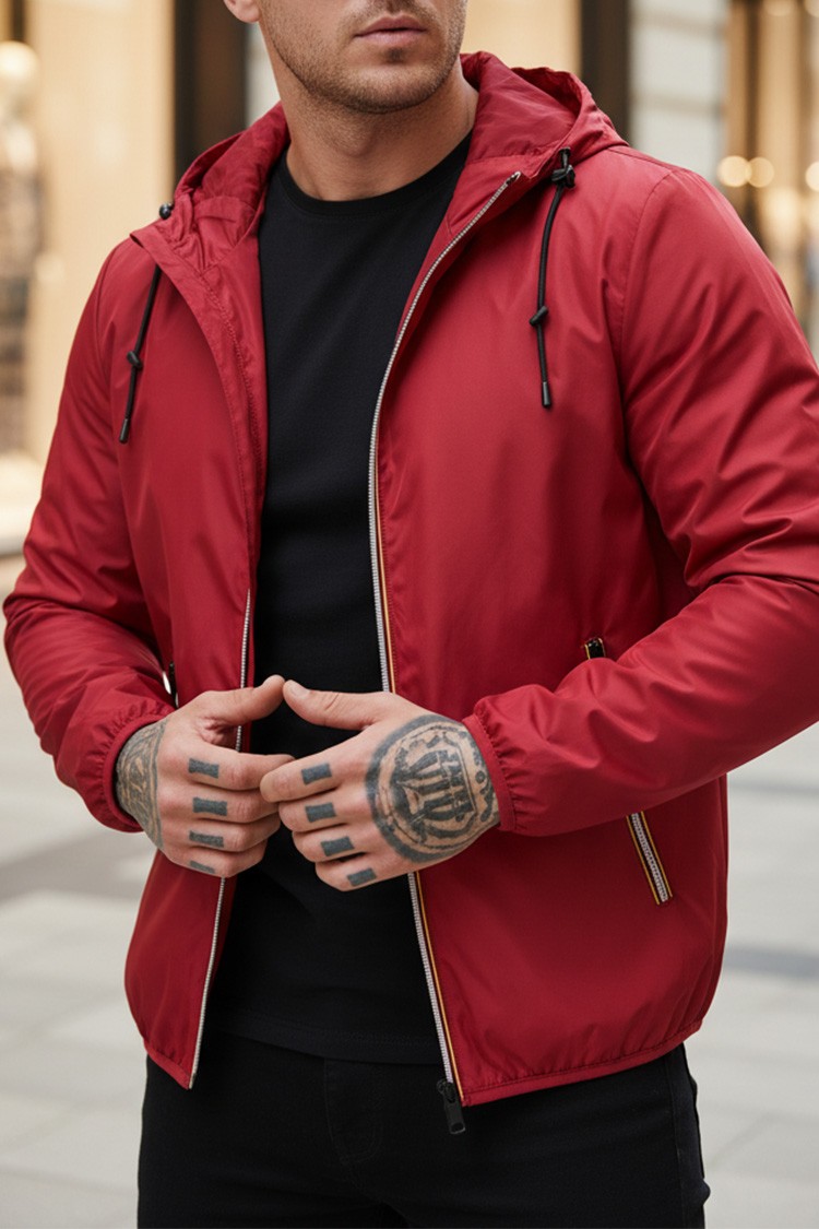 - Osnovni model muške jakne u crvenoj boji sportsko-svakodnevnog stila, prikladan za prijelazna godišnja doba.