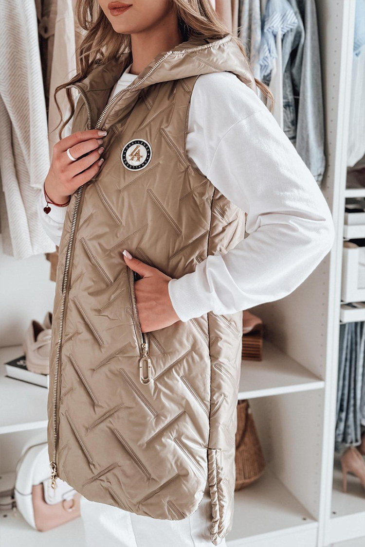 - Prsluk ima klasičan kroj, ovratnik, džepove, prošiveni dizajn i kapuljaču.