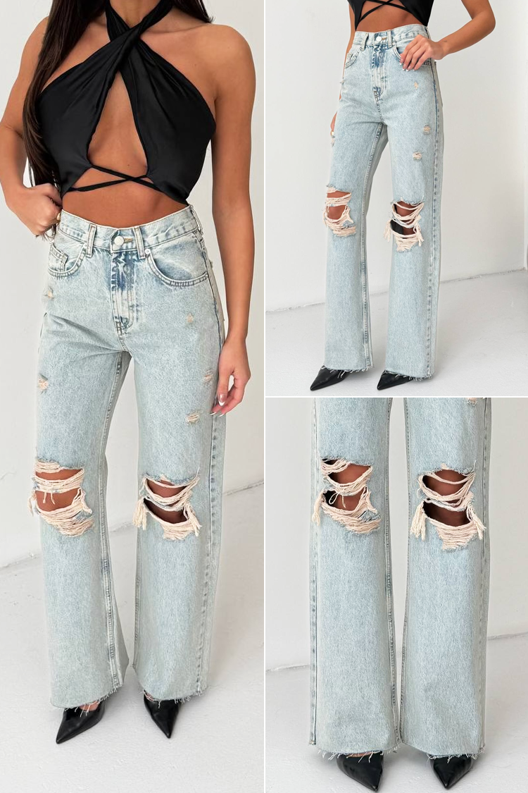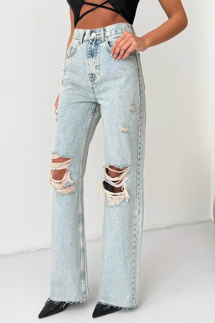 - Model ima visoki struk, džepove, široki kroj, moderan poderani efekt i svijetloplavi uzorak.