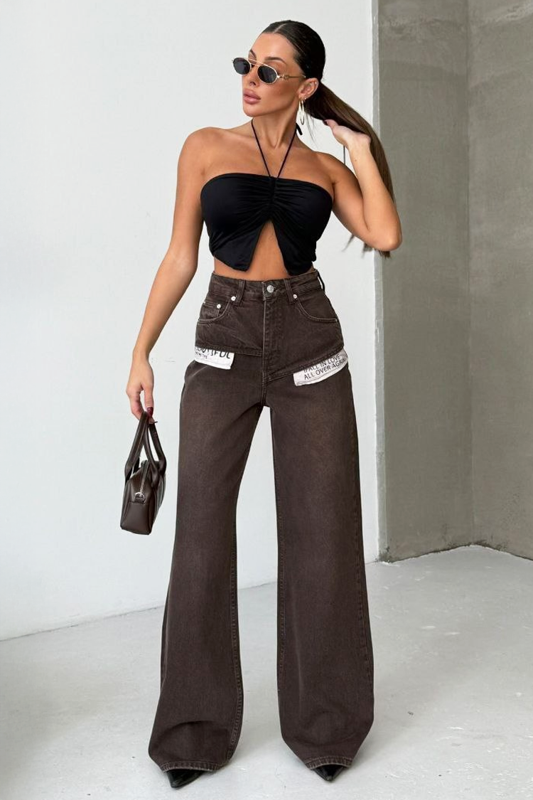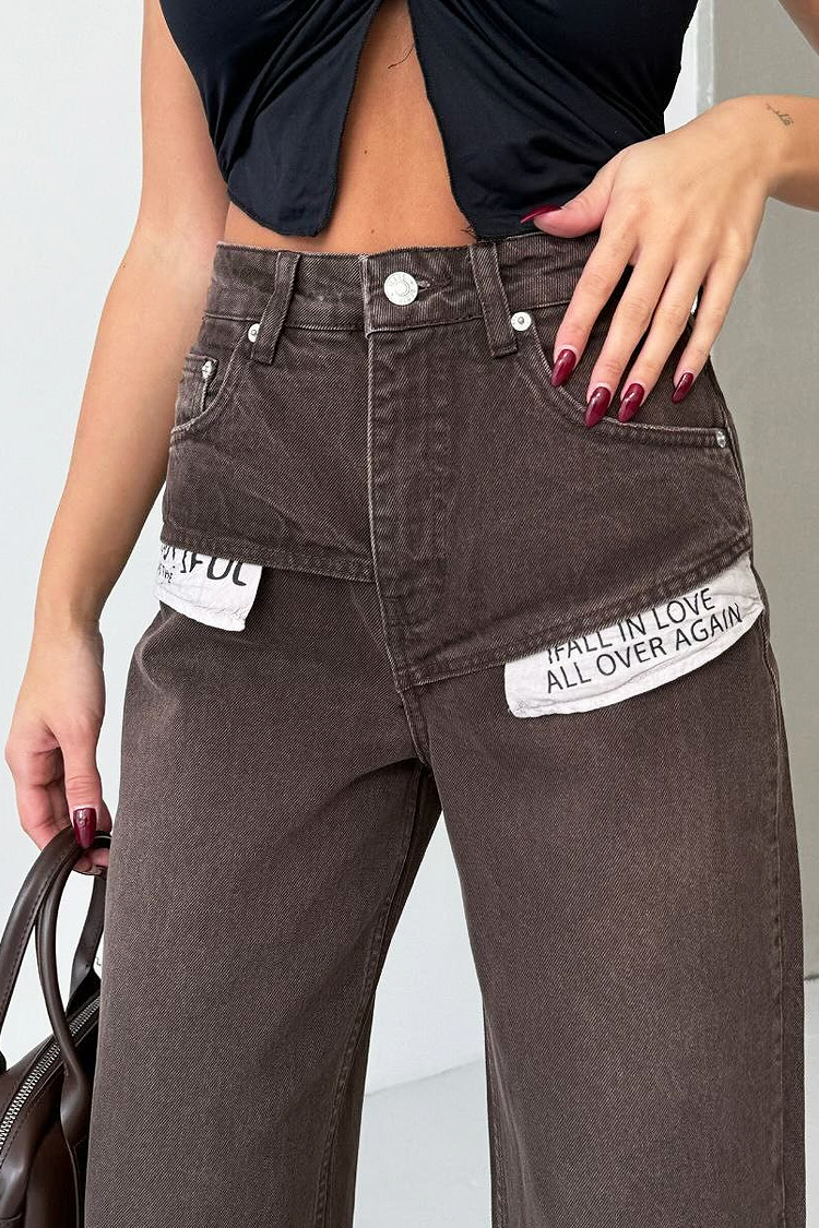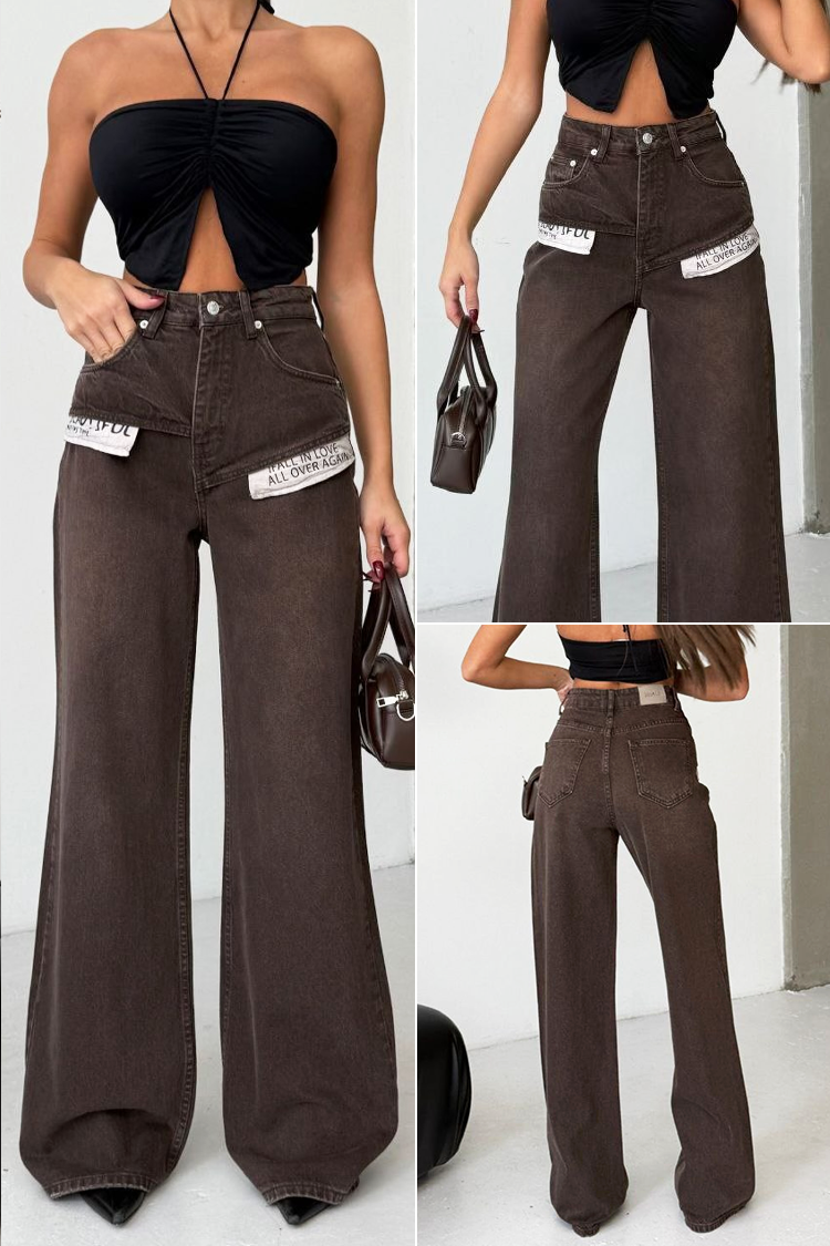 - Model ima visoki struk, džepove, široki kroj, spektakularne detalje i smeđi uzorak.