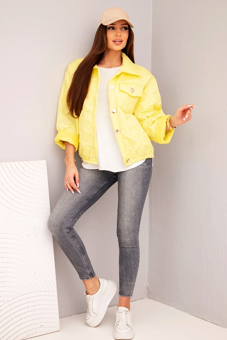 - Model ima kratku duljinu i prošiveni dizajn, džepove i kopčanje gumbima sprijeda.