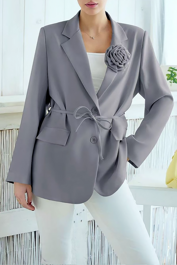 - Model ima elegantan kroj, klasičan ovratnik, remen od iste tkanine i ukrasnu ružu.