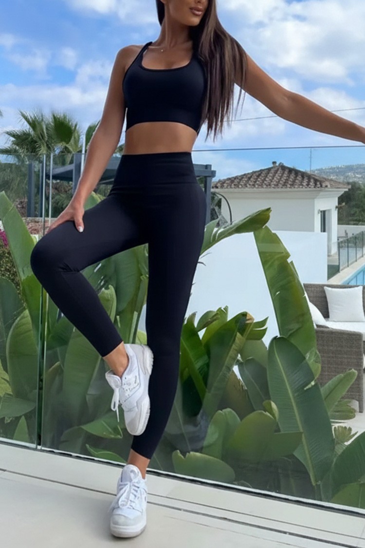 - Ženski dvodijelni sportski set u crnoj boji, prikladan za sport i svakodnevni život.