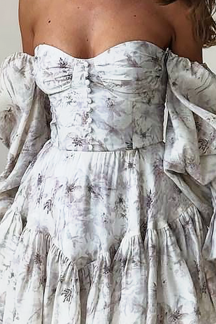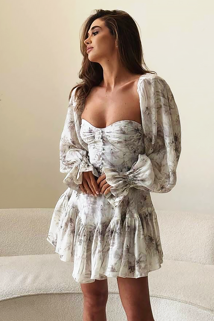 - Model ima duge rukave, otvorena ramena, seksi dekolte i atraktivni uzorak.