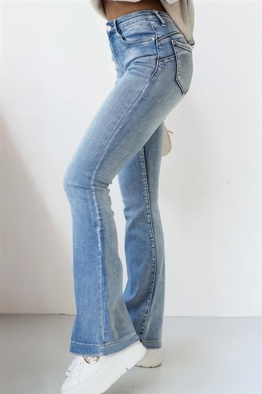 - Model ima visoki struk, pripijeni kroj, bočne džepove i svijetloplavi uzorak.