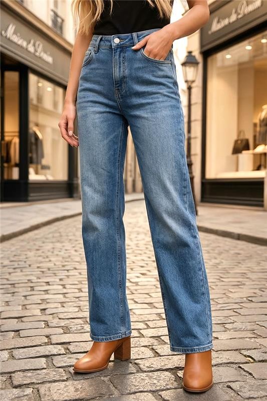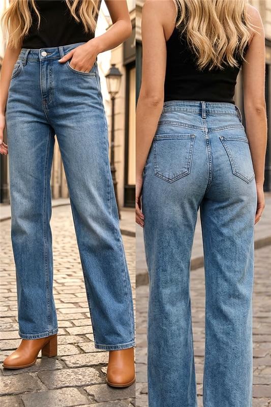 - Model ima visoki struk, široke nogavice i svijetloplavi uzorak.