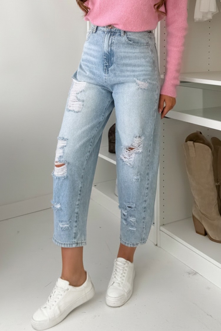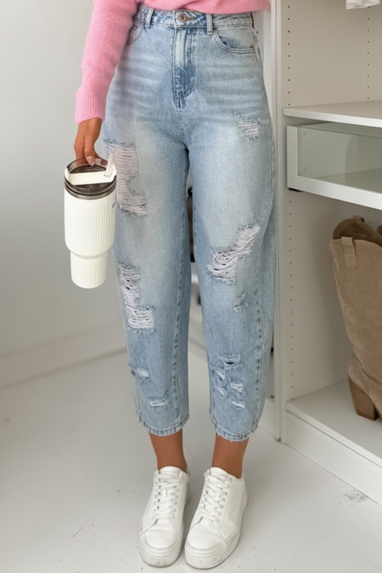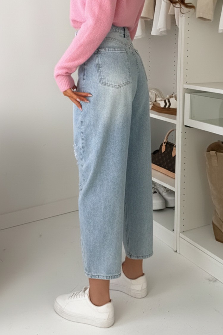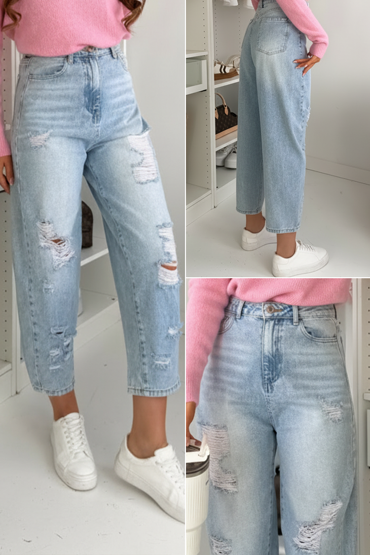 - Model ima visoki struk, džepove, široki kroj, moderan poderani efekt i svijetloplavi uzorak.
