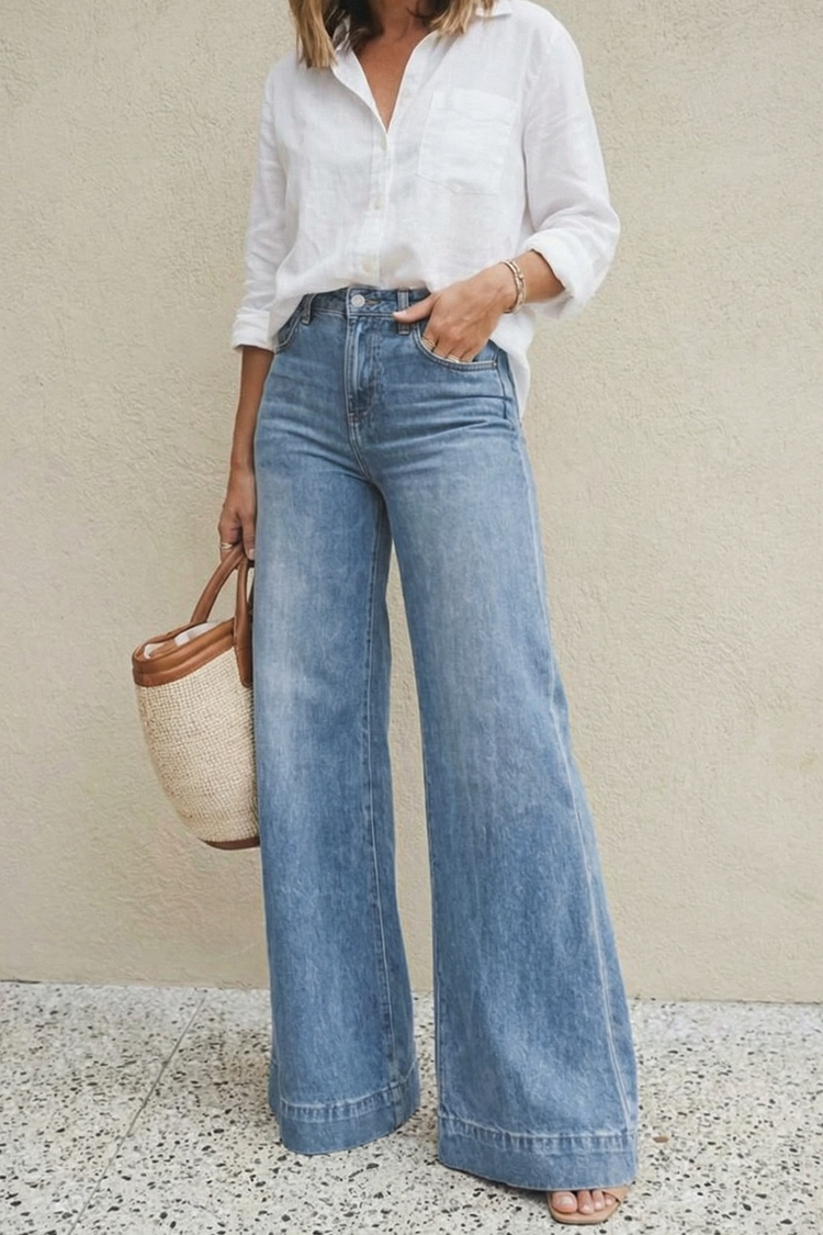 - Model ima visoki struk i prošireni kroj te moderan izblijedjeli efekt.