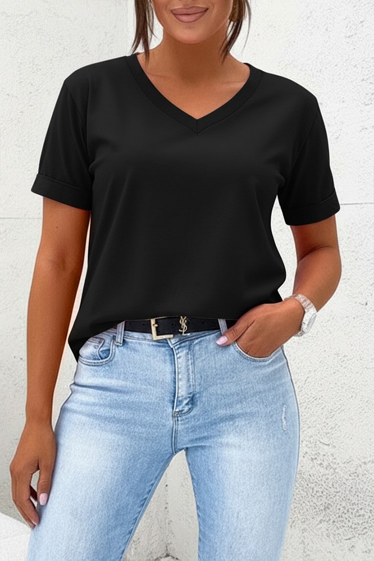 - Model ima kratke rukave, V-izrez, klasičan dizajn i crnu boju.