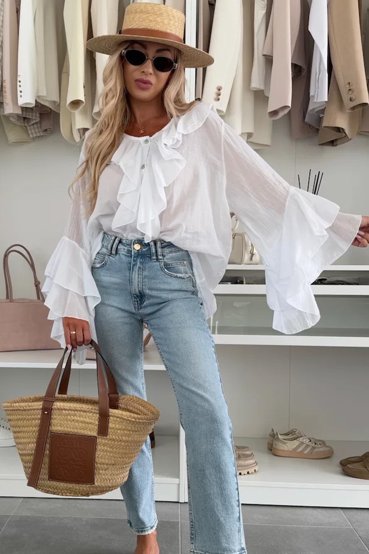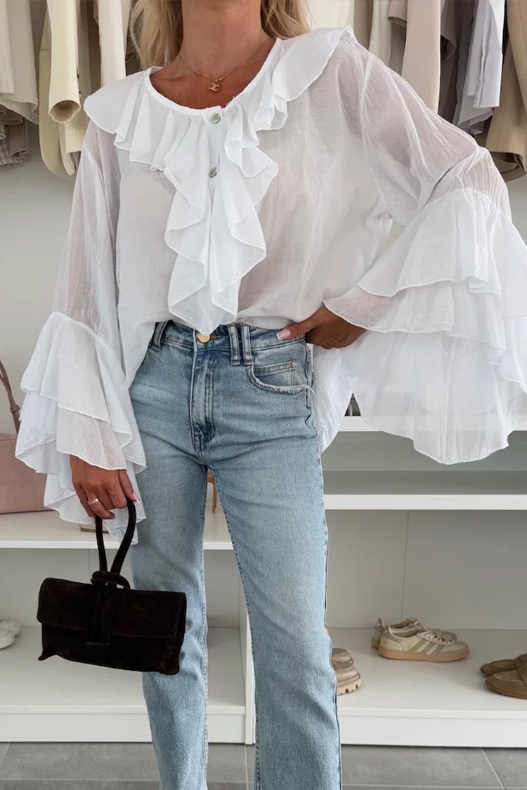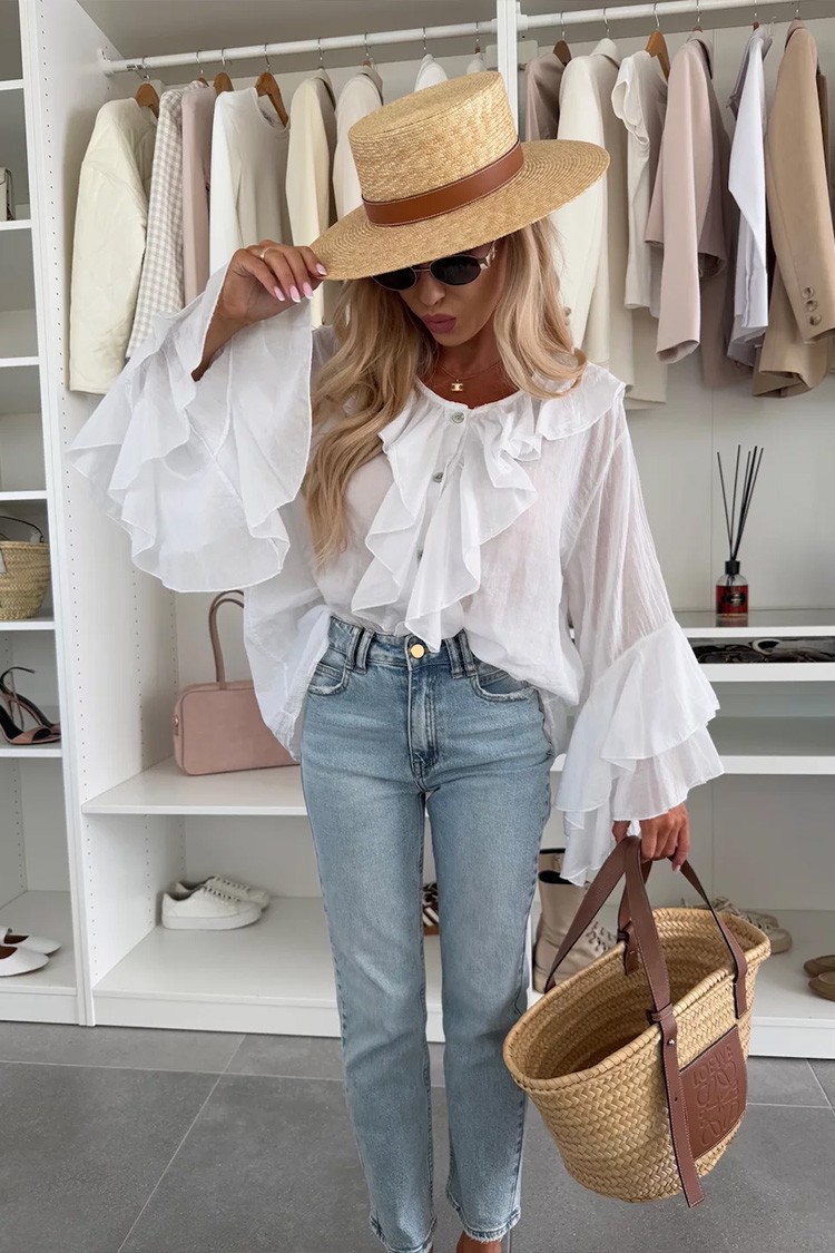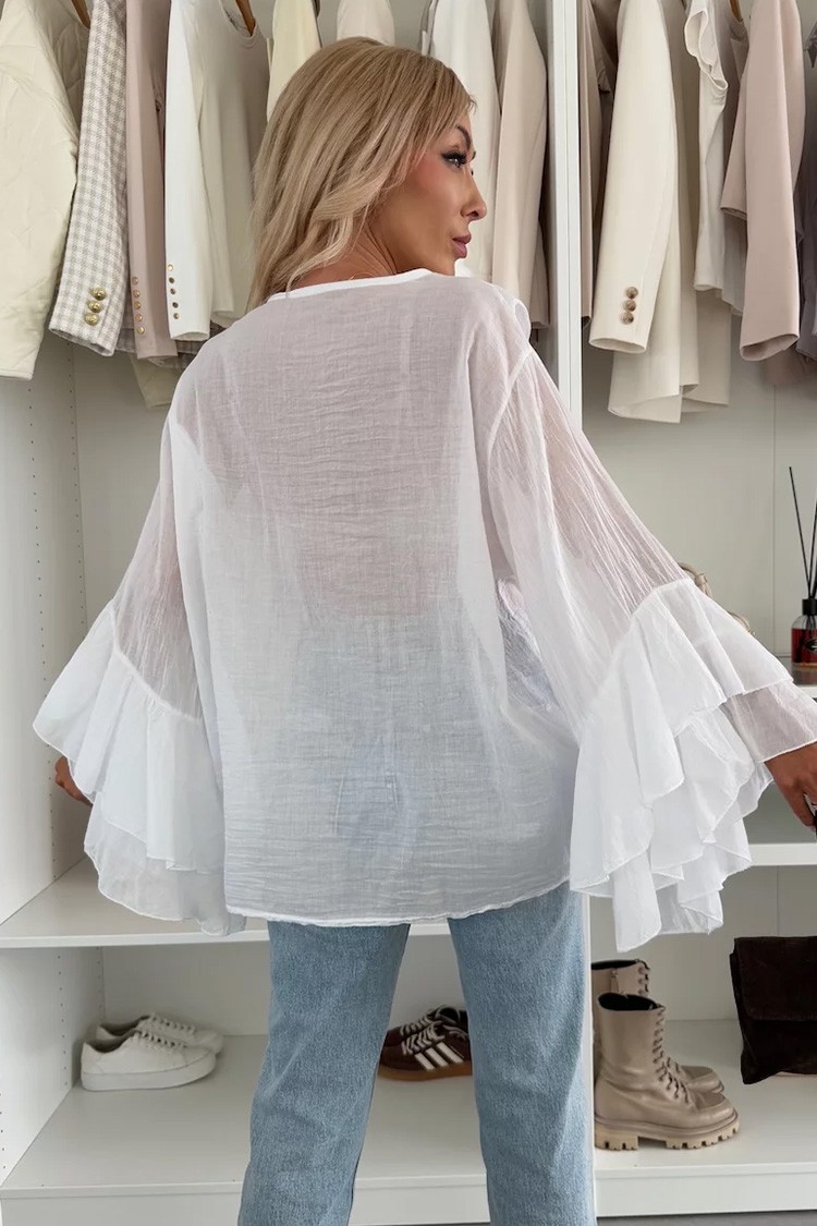 - Model ima labav kroj, gumbe, atraktivan dizajn i volane cijelom dužinom.