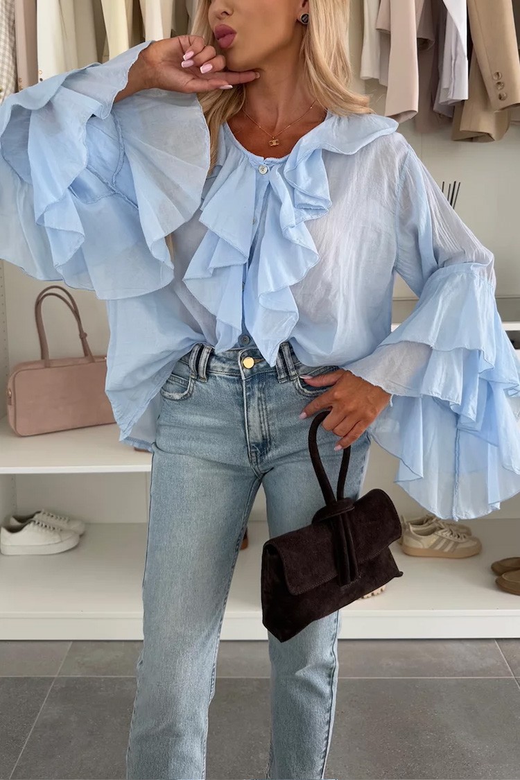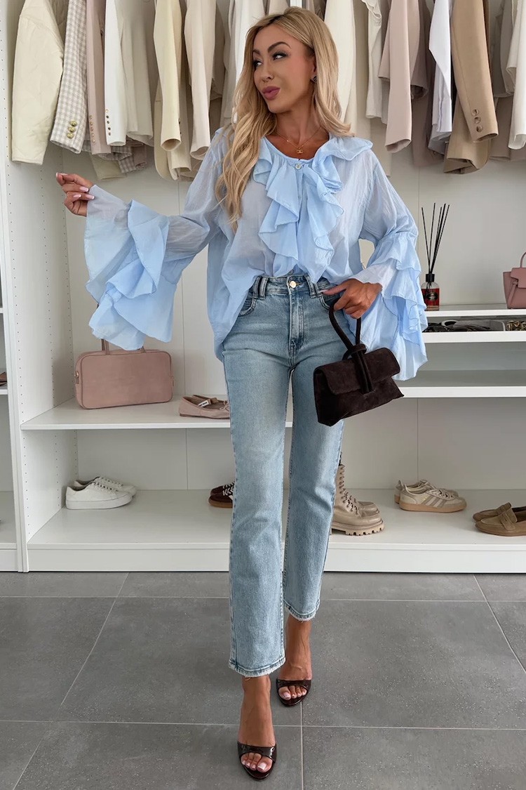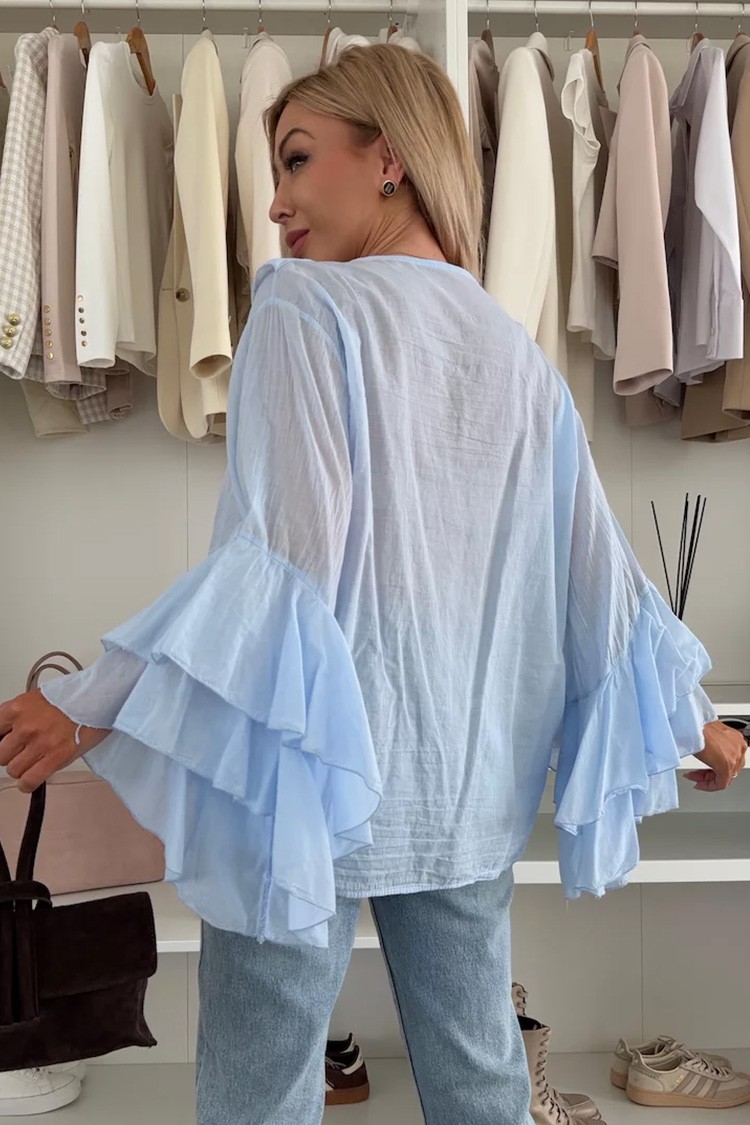 - Model ima labav kroj, gumbe, atraktivan dizajn i volane cijelom dužinom.