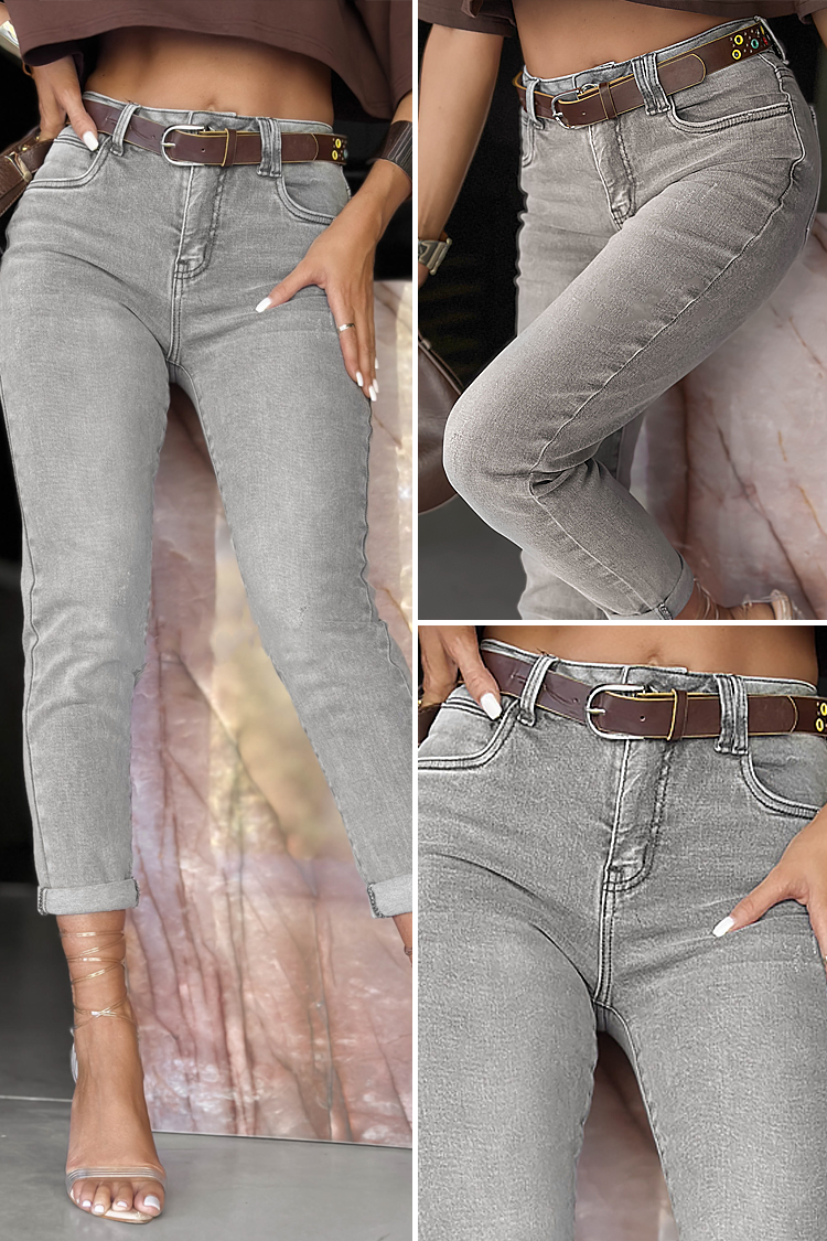 - Model ima visoki struk, uski dizajn, svijetlo sivi uzorak i smeđi remen.