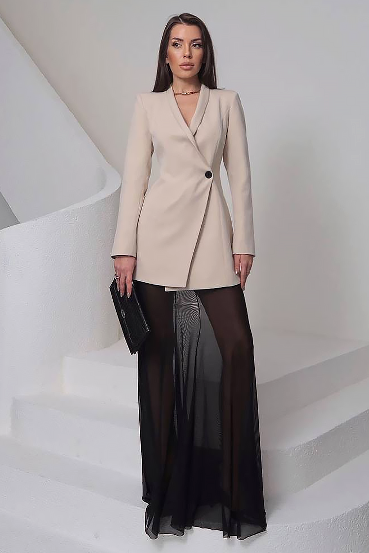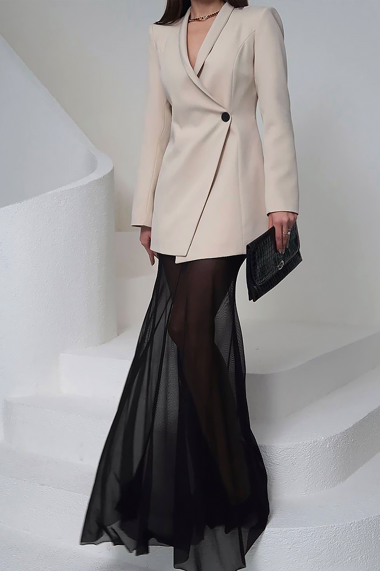 - Suknja ima klasičan struk, dugu duljinu i prozirnu tkaninu.