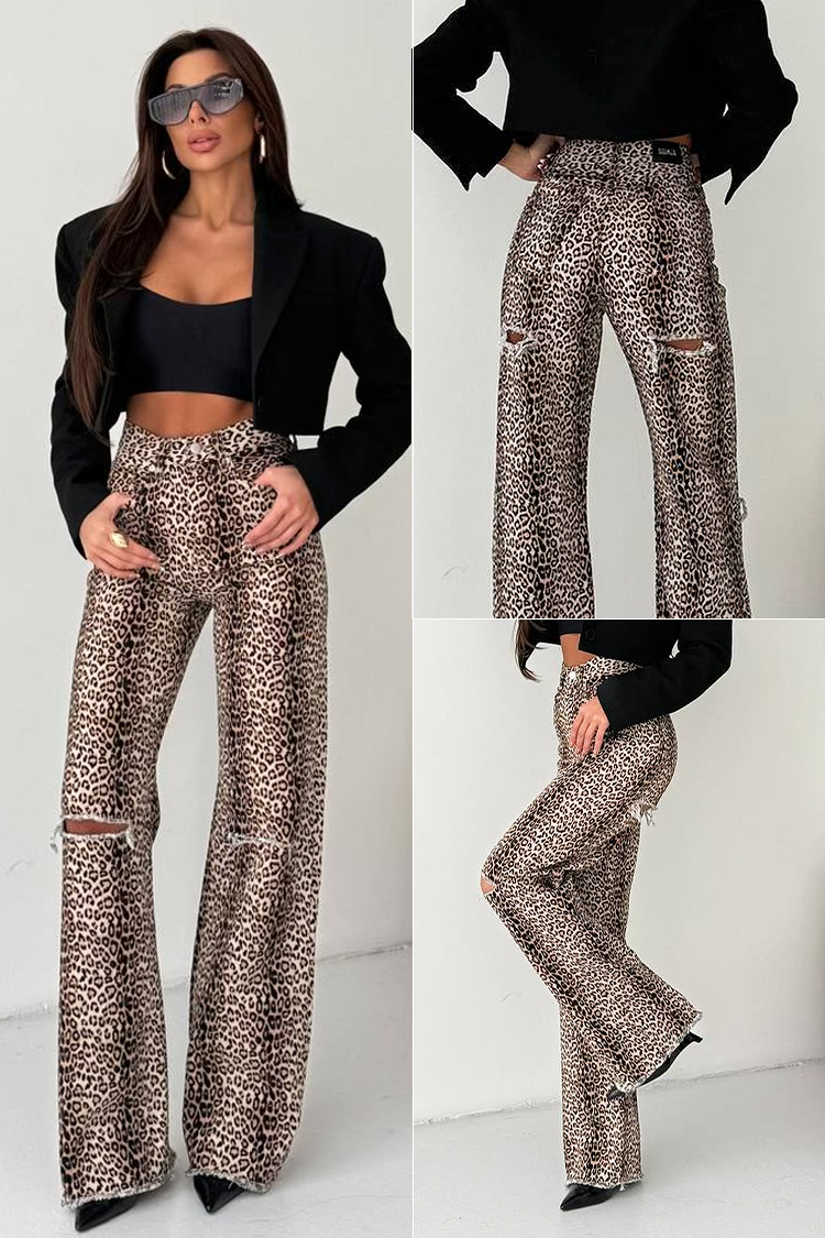 - Model ima široke nogavice, visoki struk, širok kroj, poderani efekt i leopard print.