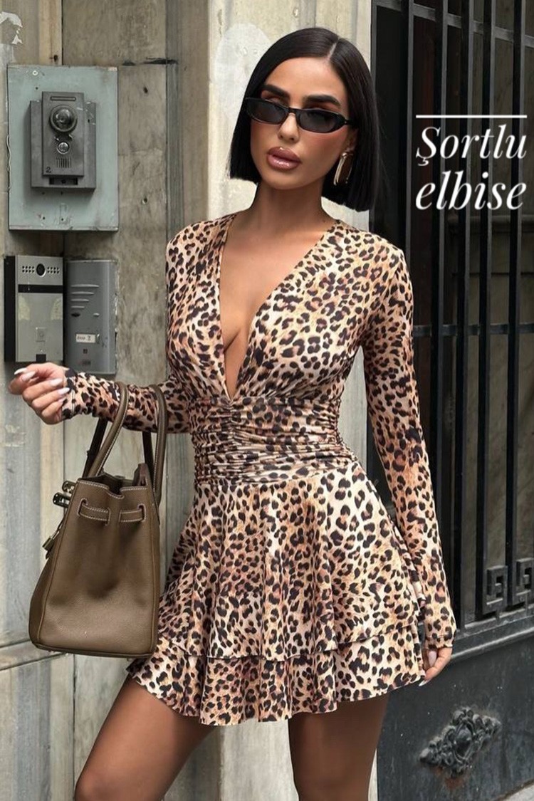 - Haljina ima atraktivan kroj, leopard print, duge rukave i V-izrez.