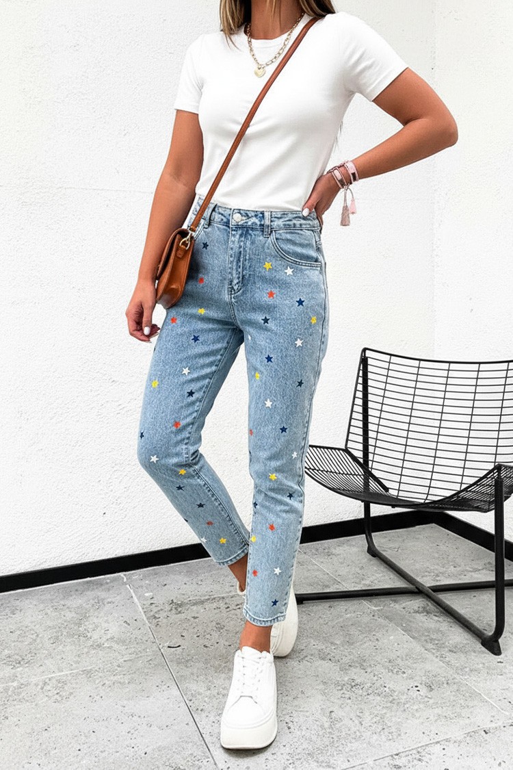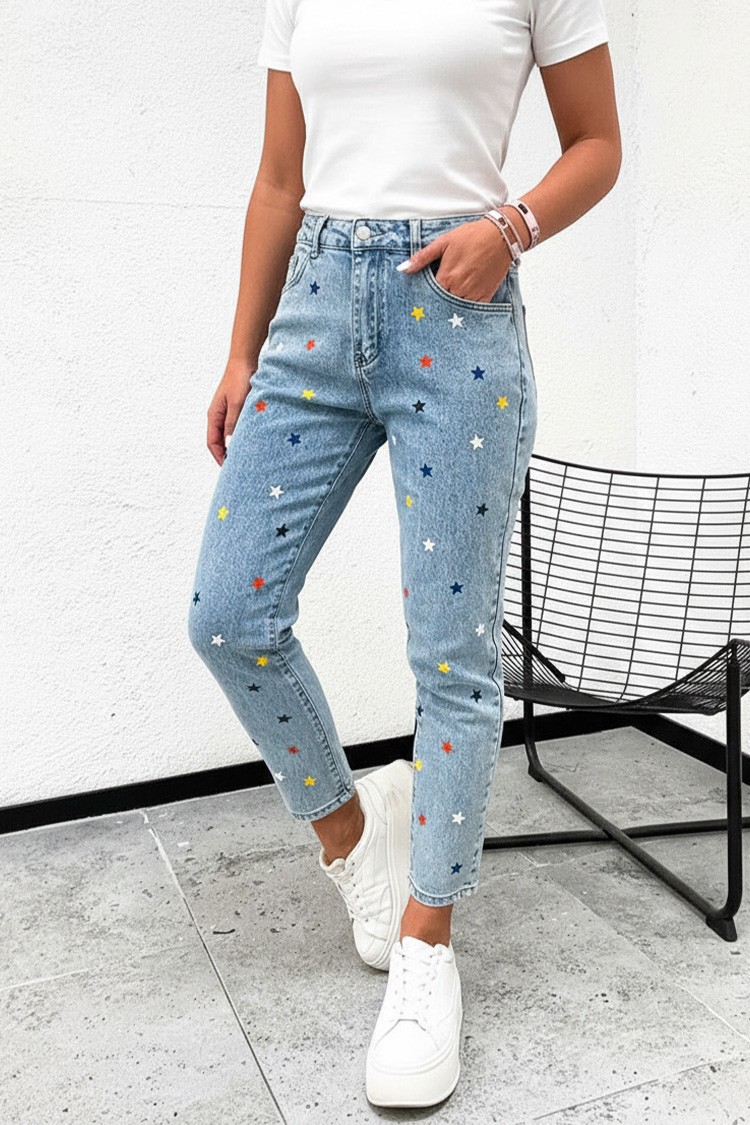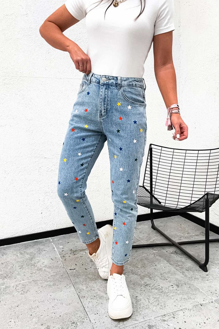 - Model ima visoki struk i klasičan kroj te šareni zvjezdani uzorak.
