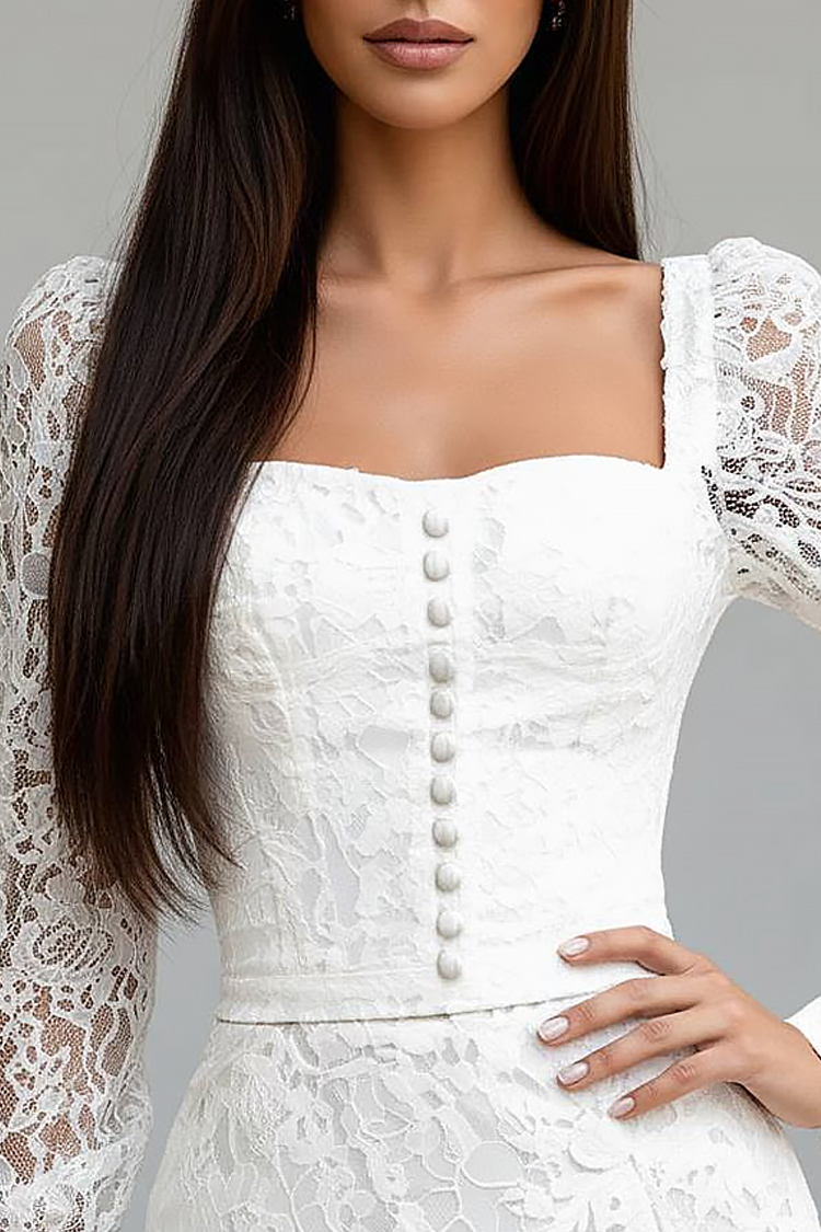 - Model ima pripijeni kroj, asimetrični dizajn, seksi čipku, duge rukave i gumbe.