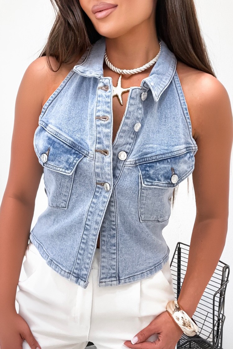 - Upotpunite svoj trendi izgled traper topom s gumbima sprijeda u klasičnoj boji.