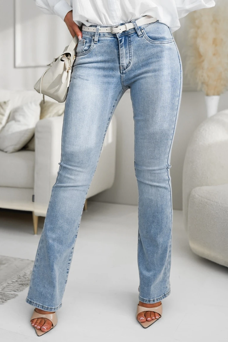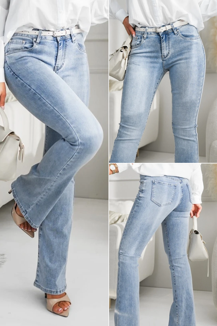- Model ima visoki struk i prošireni kroj, bočne džepove i svijetloplavi uzorak.