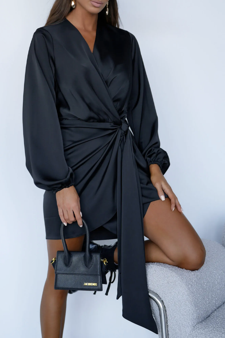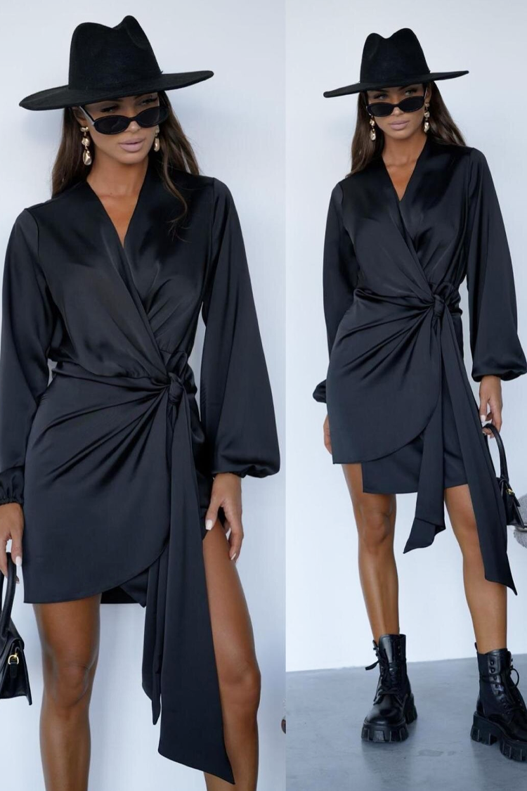 - Haljina ima asimetrični kroj, crnu boju, duge rukave i vezice sa strane.