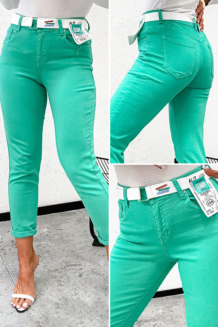 - Model ima visoki struk i uski kroj te bijeli tekstilni remen.