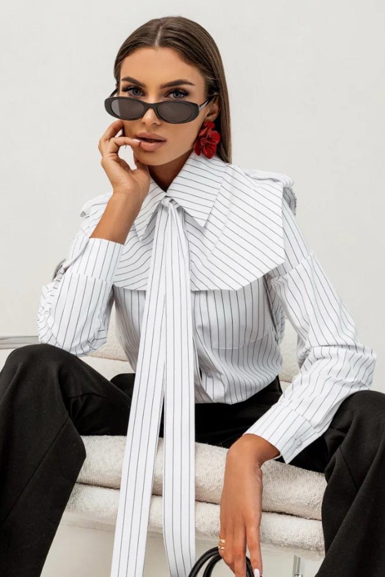 - Model ima duge rukave, spektakularnu ravnu prugu i kravatu.
