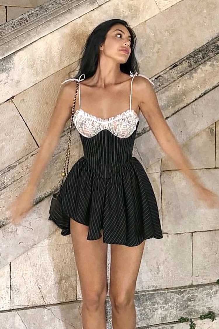 - Model ima atraktivan dekolte s bijelom čipkom, prugastim uzorkom i seksi dizajnom.