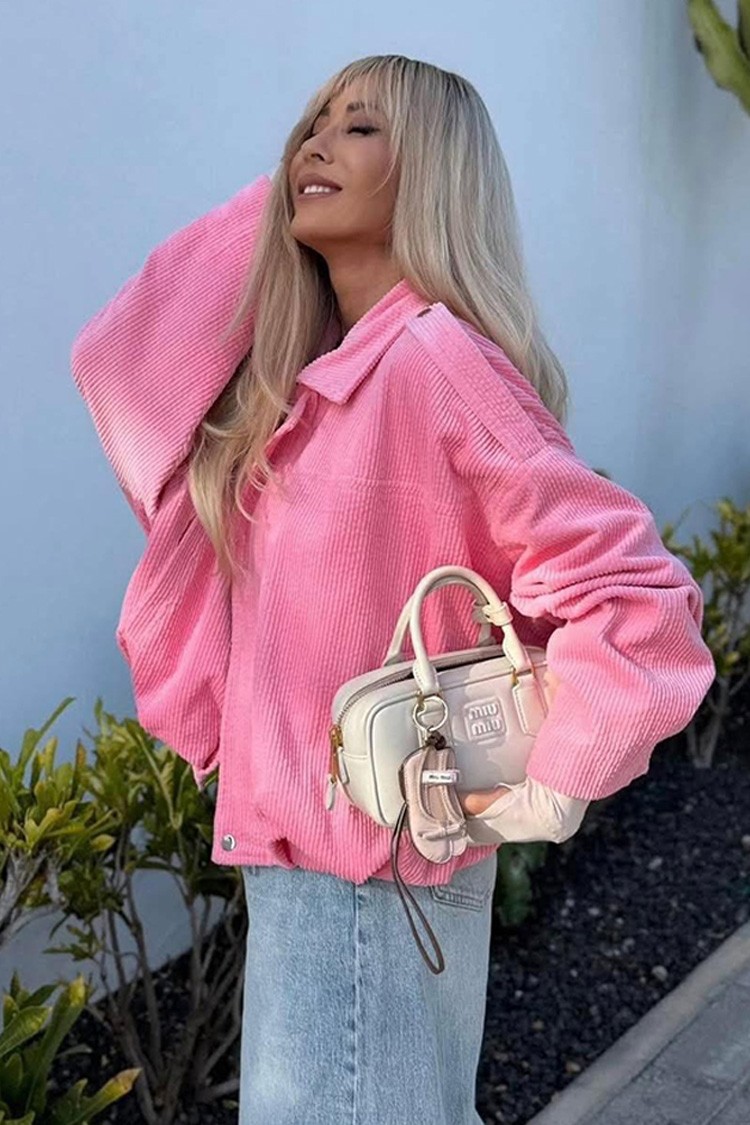 - Model ima predimenzionirani kroj, rebrastu tkaninu, koketni dizajn, ružičastu boju i kopča se patentnim zatvaračem i gumbima.