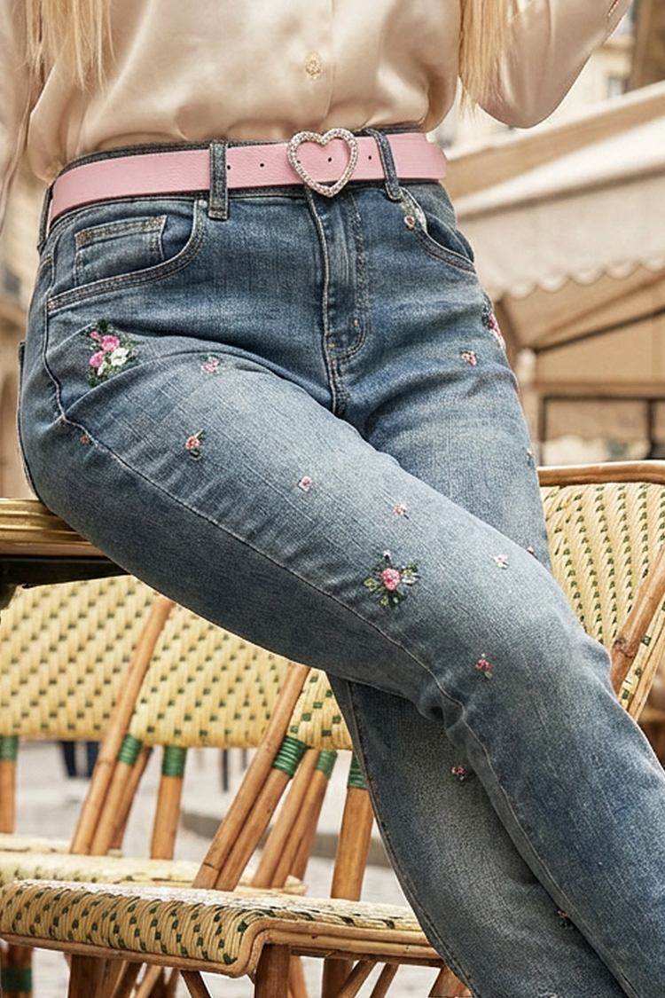 - Model ima visoki struk, uski kroj, ružičasti remen i cvjetni vez.