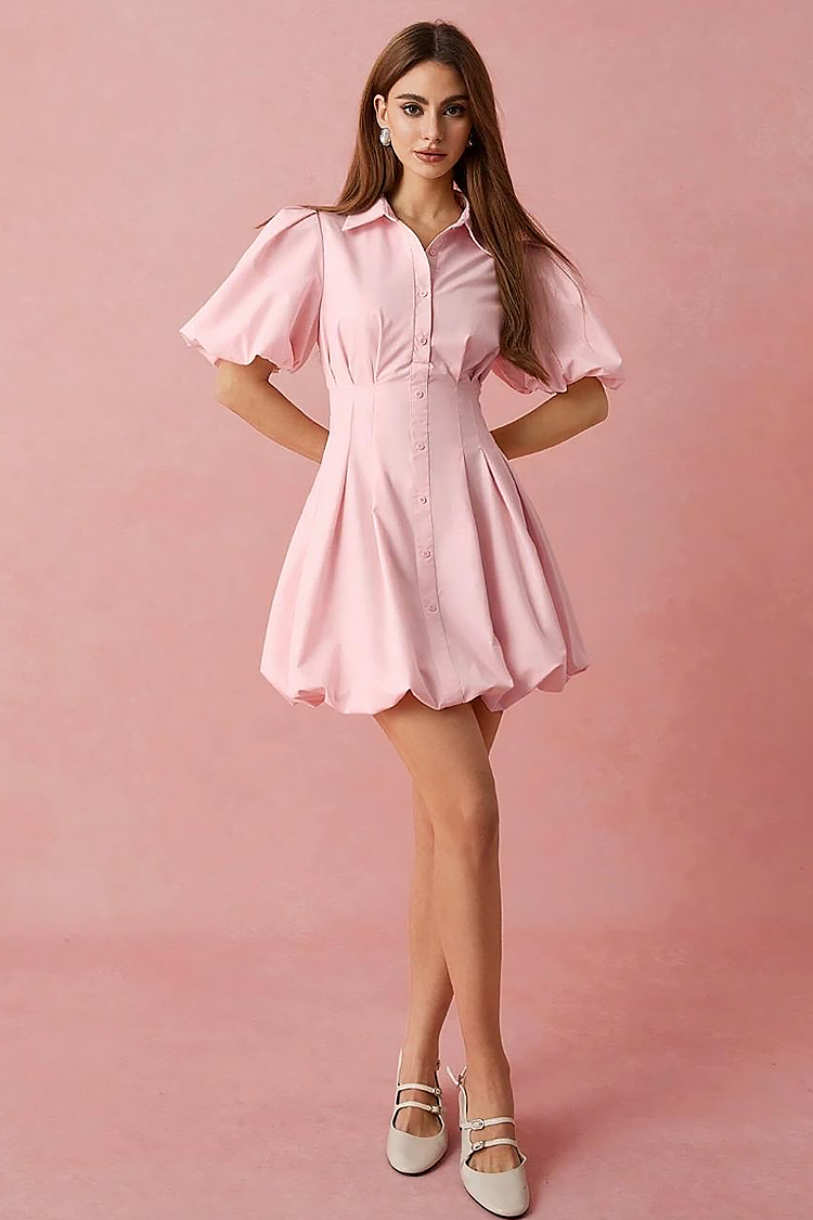- Model ima kratku duljinu, gumbe sprijeda, puderastu boju i puf rukave.