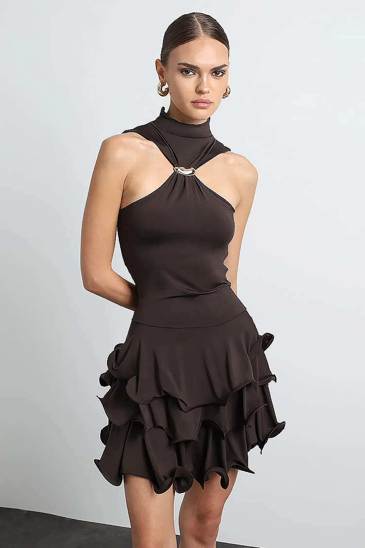 - Model ima kratku duljinu, seksi dizajn, volane i asimetrični gornji dio s metalnim detaljem.