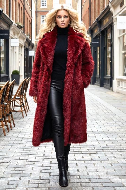 - Model ima klasičan i elegantan kroj, voluminozan ovratnik i bordo boju.