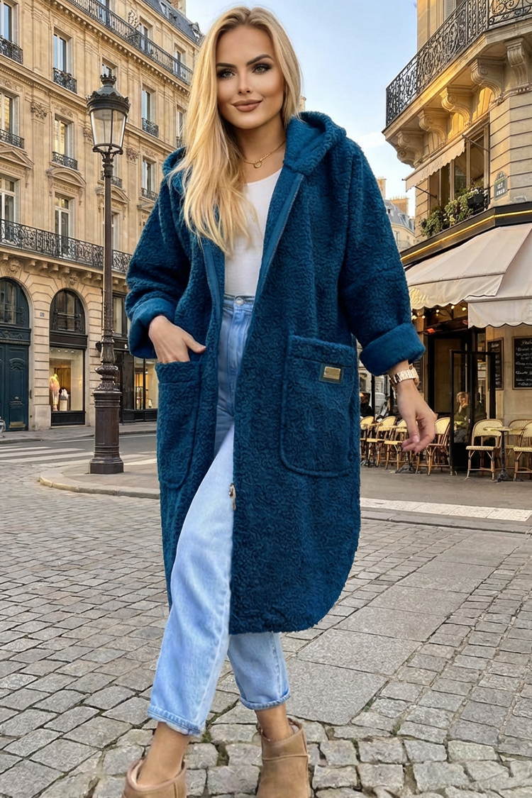 - Model je u trendi boji, širokog kroja, s džepovima i kapuljačom.