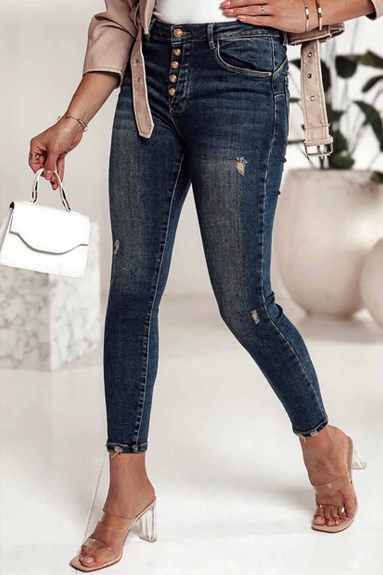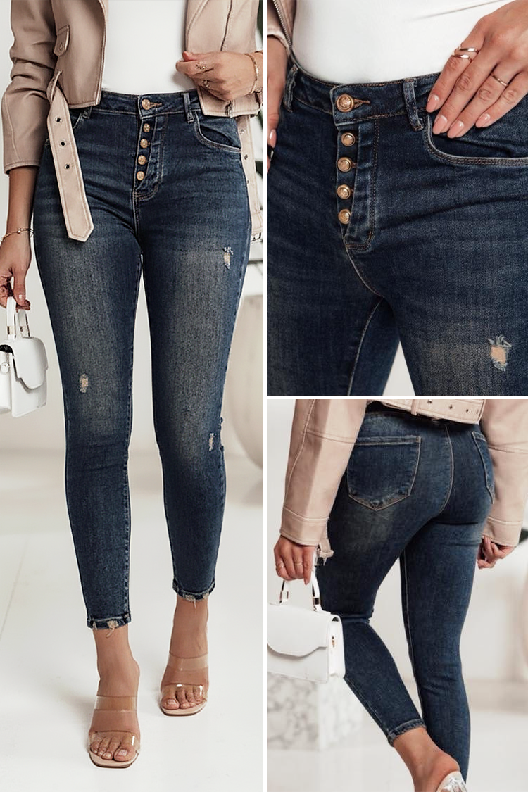 - Model ima visoki struk, uski kroj i spektakularne gumbe sprijeda.