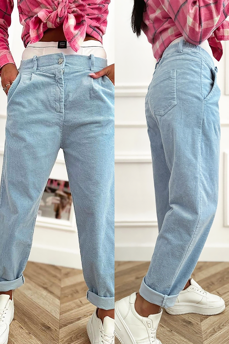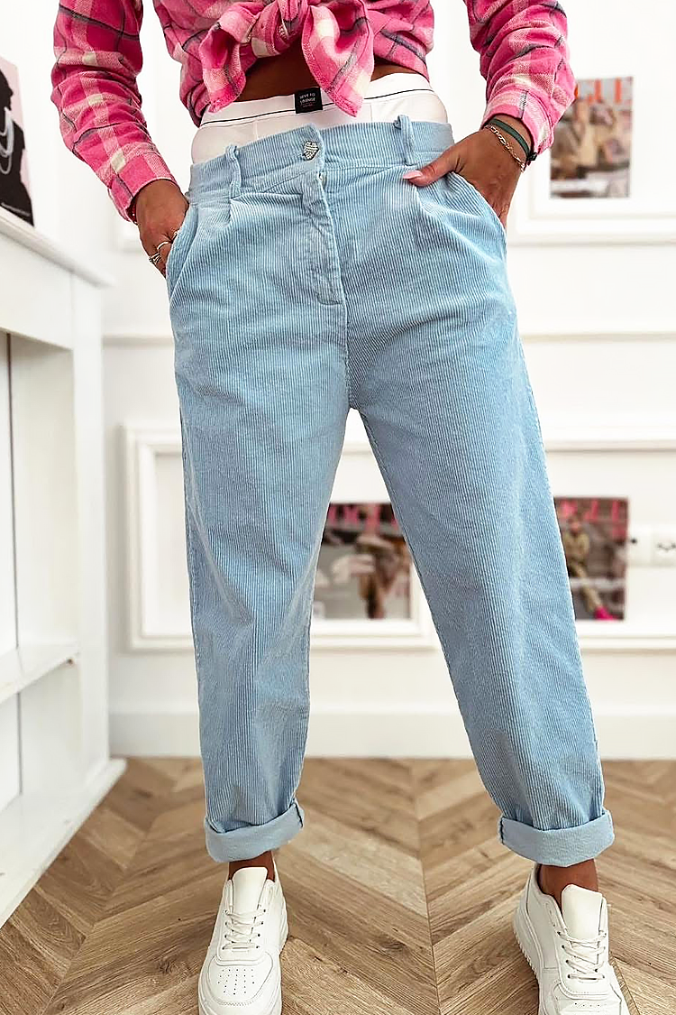 - Model ima visoki struk, ravan kroj i rub na nogavicama s praktičnim džepovima.