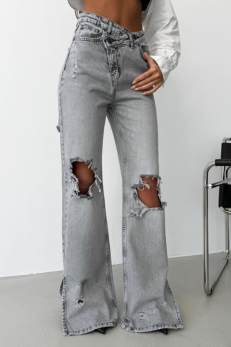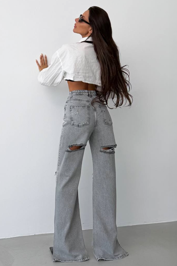- Model ima moderno asimetrično kopčanje i spektakularne poderane detalje.