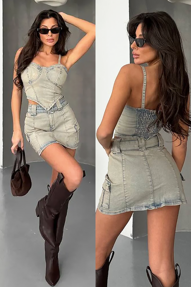 - Dvodijelni traper set: top i kratka suknja, prikladan za svakodnevne trendi izglede.