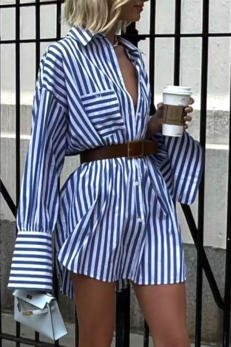 - Model ima kratku duljinu, široki kroj, ovratnik, gumbe i prugasti uzorak.