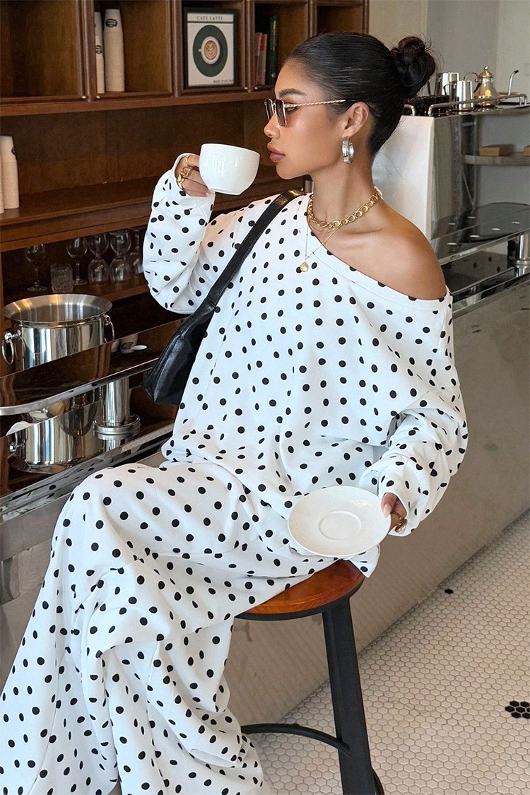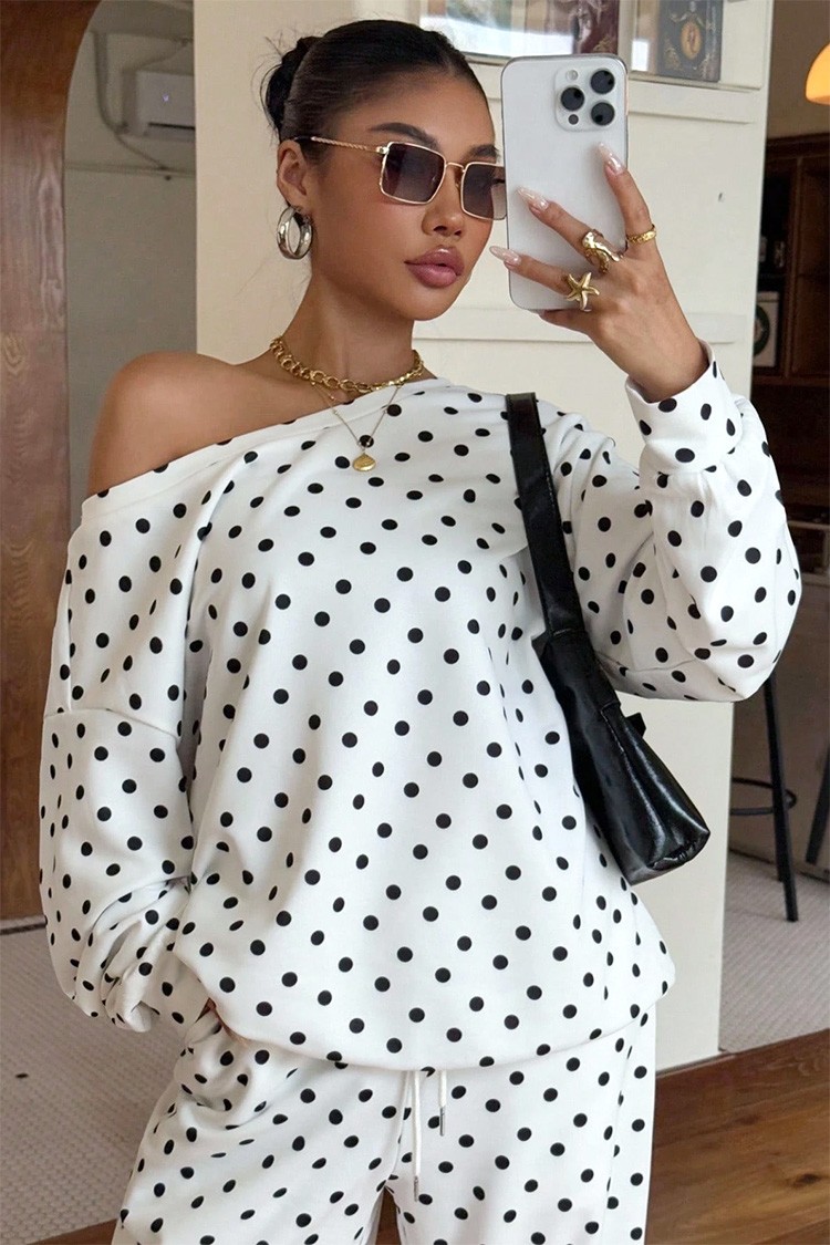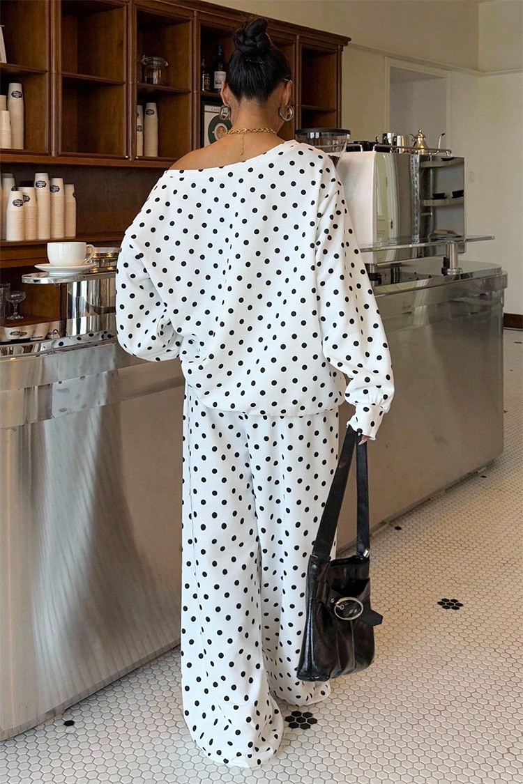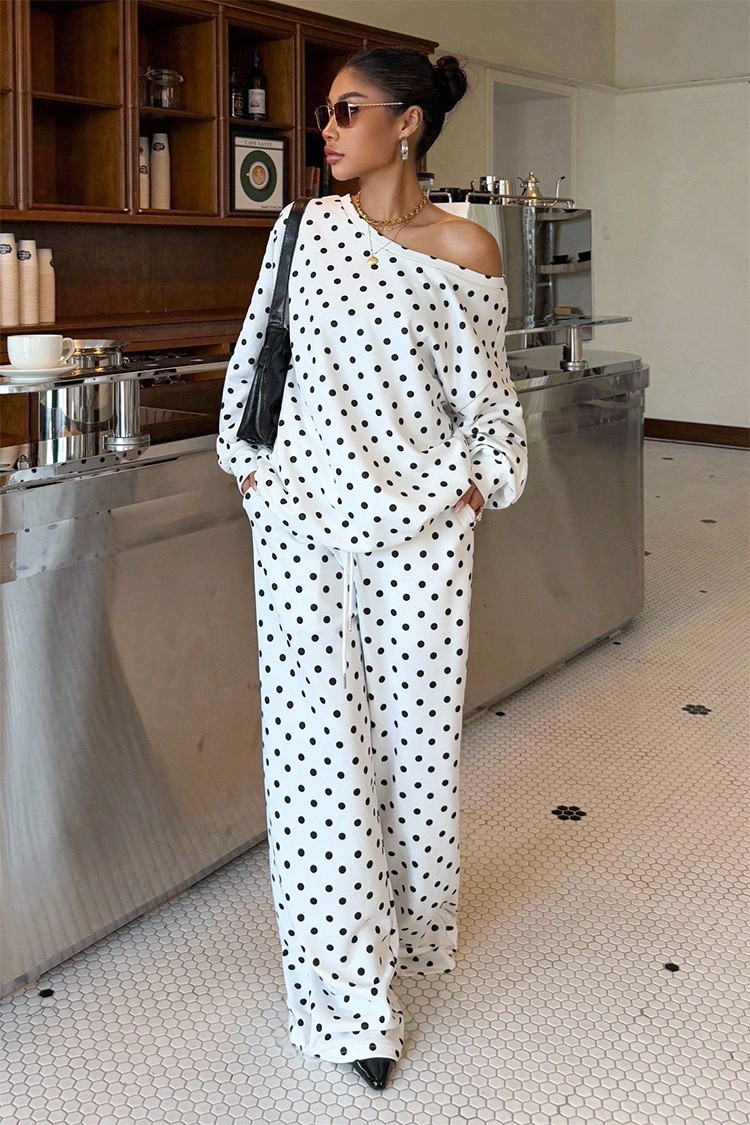 - Ženski ležerni dvodijelni set s točkastim uzorkom, prikladan za trendi izgled.