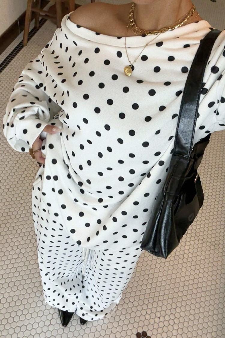 - Bluza ima predimenzionirani kroj, točkasti uzorak, a hlače imaju široki dizajn i visoki struk.