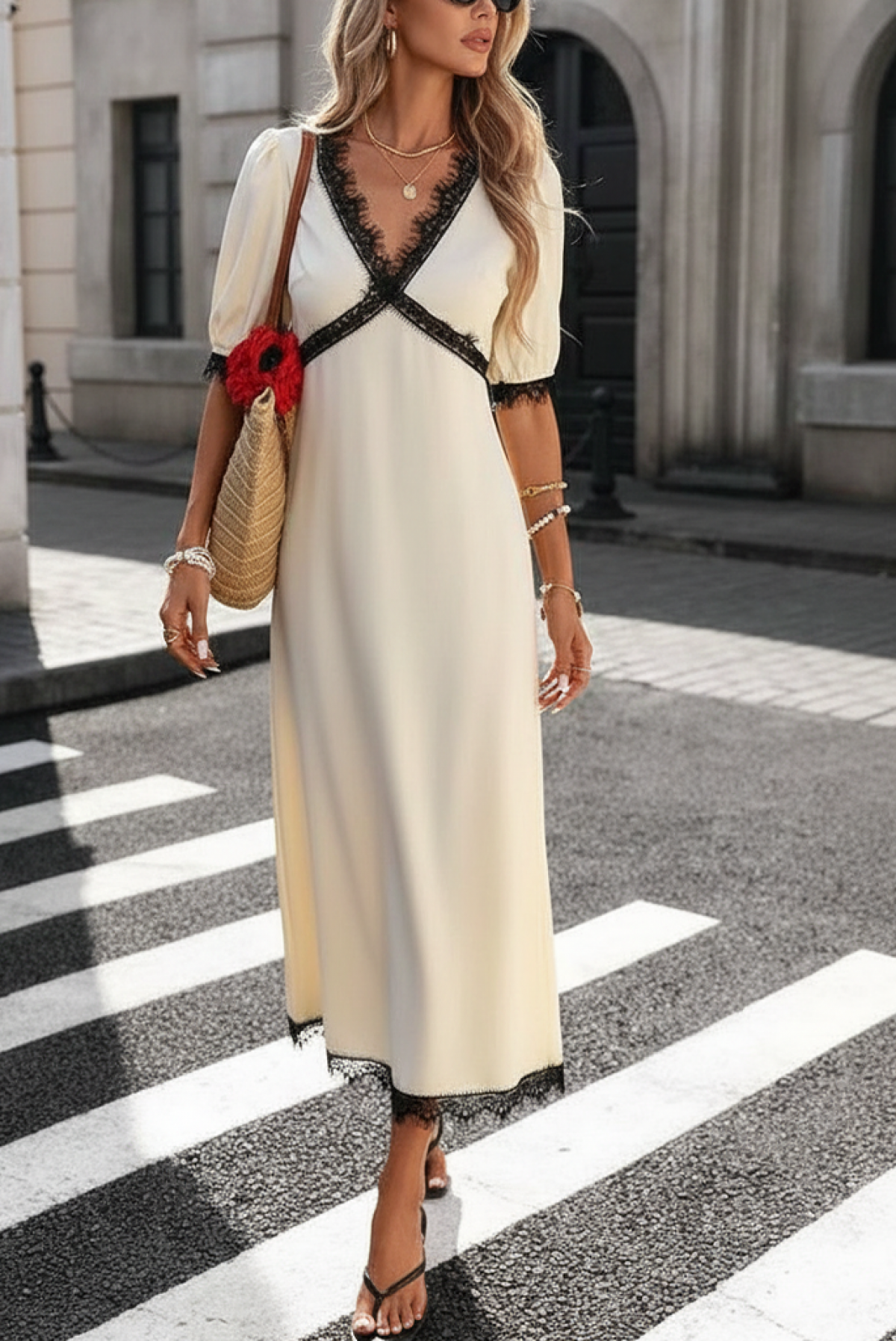 - Model ima klasičan kroj, kratku duljinu, ecru boju i crnu čipku.
