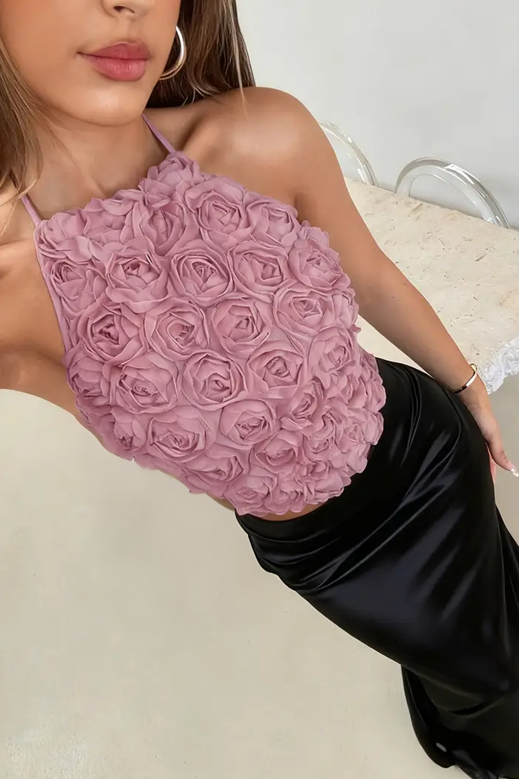 - Model ima koketni dizajn, ružičastu boju, halter dekolte i 3D cvijeće.